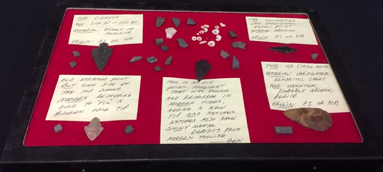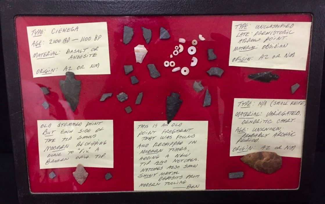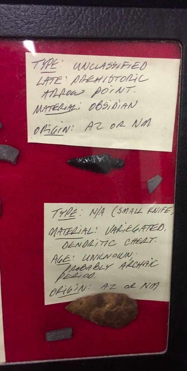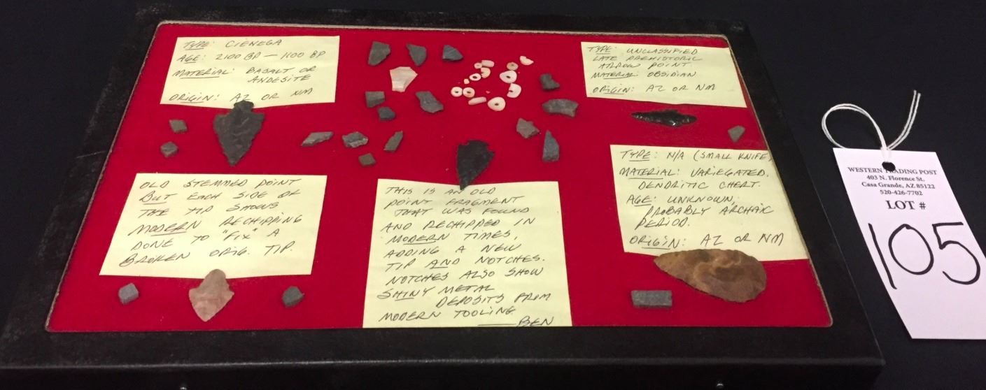 Maker: Unknown, all believed to be AZ artifacts. Approx. Age: Prehistoric. Size: Shadowbox they are displayed in is 8” X 12”. Condition: As found and restored (see notes on a couple of the points). Additional Info: Prehistoric stone points and shell and slate bead material. Notes on arrowheads are from noted artifacts authenticator, Western Typology. Please look closely at the pictures - they are an important part of our description. Shipping: There will be a $7 handling / packaging fee for shipping this lot. The actual cost of postage will be added on top of that.