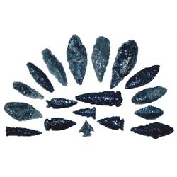 Prehistoric California obsidian knife & arrow points (18); many sizes, some very fine examples, 7/8"