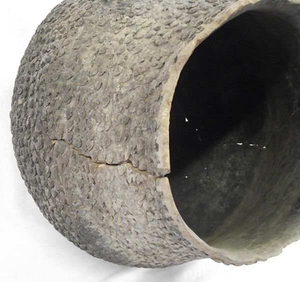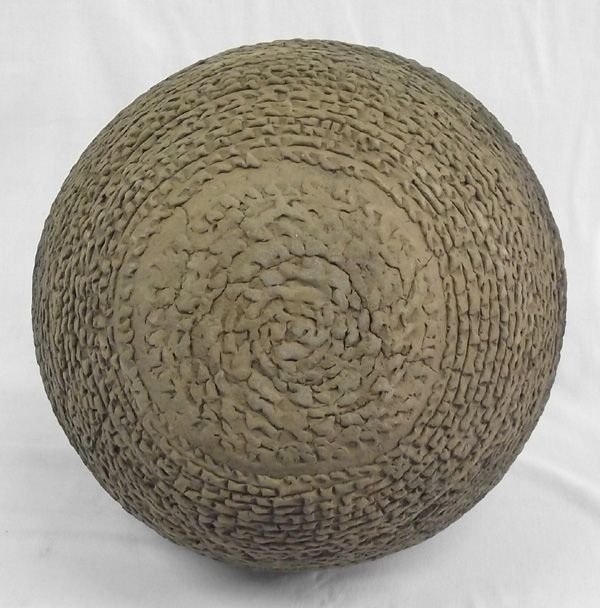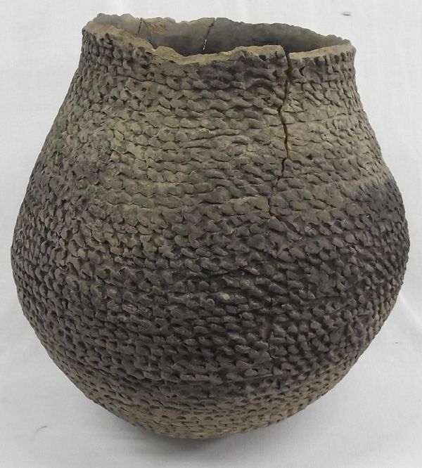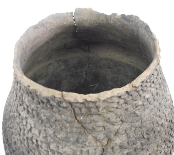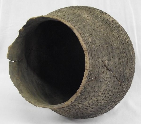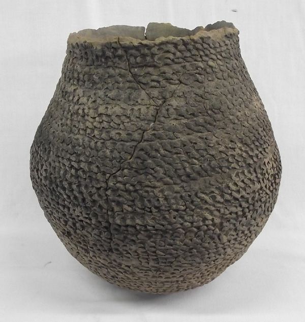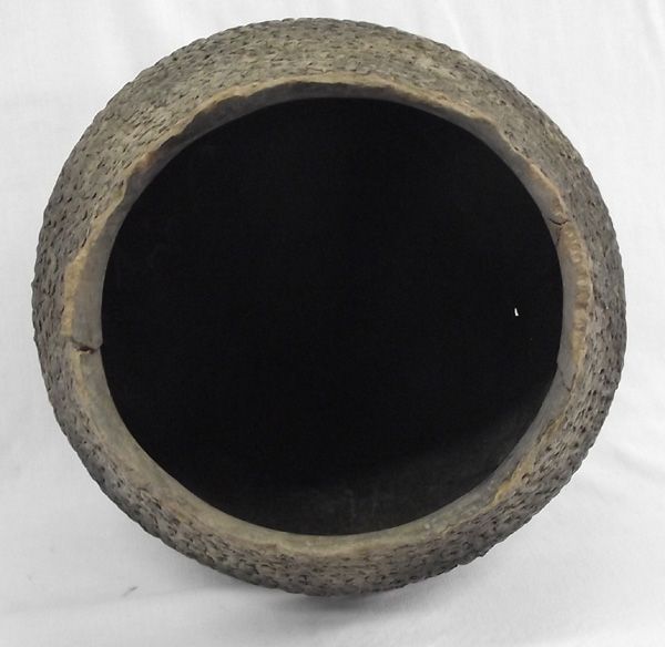 Huge Prehistoric Obliterated Corrugated Utilitarian Pottery Storage Jar from Santa Fe New Mexico Estate. Utiliarian storage olla, coil built-up method of construction corrugated exteriour, 42 1/2" Circumgrence, 14"H x 9" D at opening. These huge jars were used for water, & food stuff storage. Acquired on private pottery in accordance with all Federal and State Laws and Regulations. Comes with COA paperwork