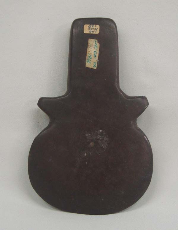 Prehistoric Fiddle Stone Scraper Replica, measures approx. 6.5L x 4''W. Texas Estate I.D.# 138. Large Stone Scraper with Handle used to skin large Elk or Bear Hides. Actual Origin & Age Unknown. There is glue and red felt on one side where the owner had this piece glued on a board for display