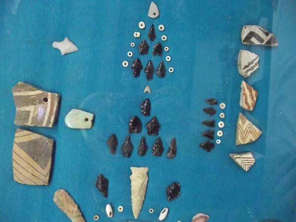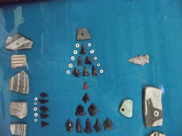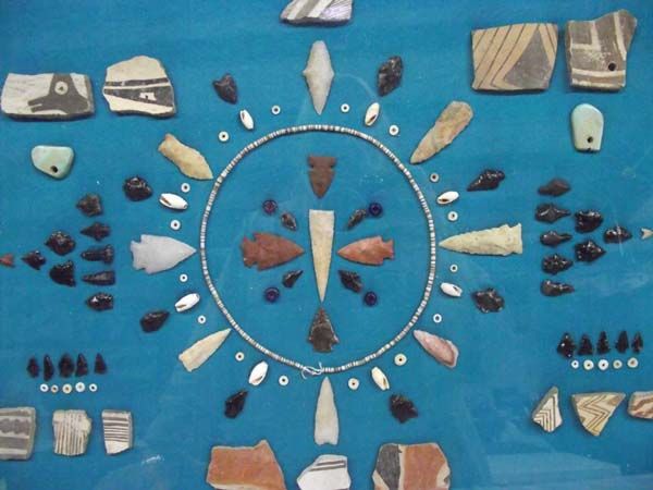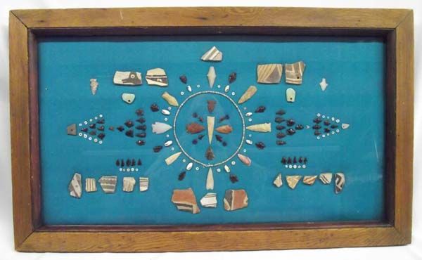 Prehistoric Framed Arrowhead Sherd Bead Display from the Myra Mahan Collection Playas, NM, wide variety of artifacts including: Turquoise Pendant, Mother of Pearl and Bone Beads, Heishi Beads, Obsidian Arrowheads, Pendants, and Painted Pottery Sherds, mounted on teal blue felt and displayed in a wood & glass case, measures approx. 33''L x 19''W, Acquired in accordance with all State and Federal Regulations, this is a must--what a phenomenal collection!