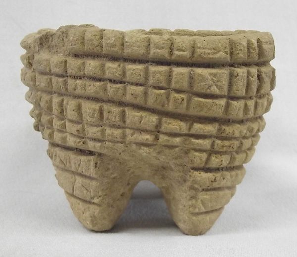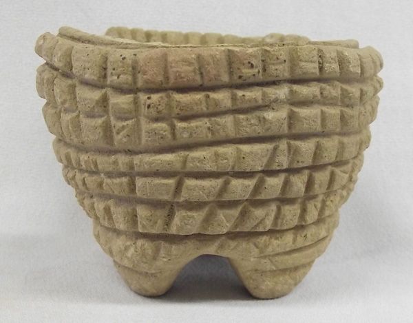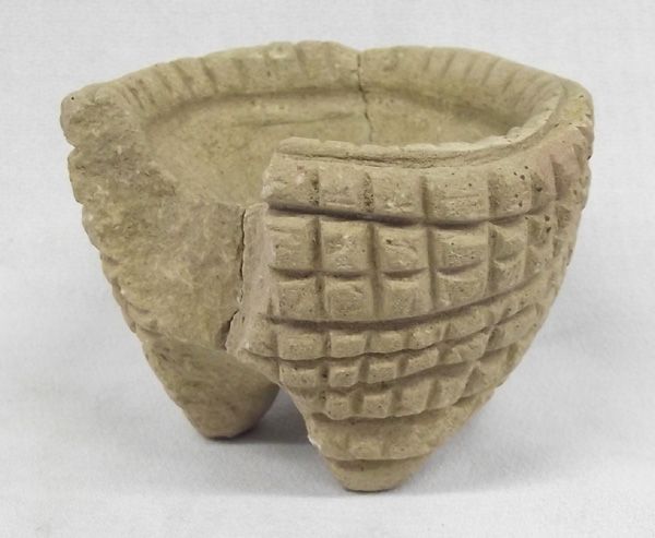 Prehistoric Hohokam incised Censor Four Legged Pot, measures approx. 2.5'' H x 3.5'' L. Sitting on four legs, incised top to bottom, missing approx. 1.5''x 2'' on one side. From private land acquired in accordance with all Federal and State Laws and Regulations.