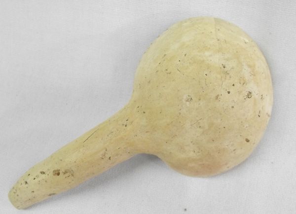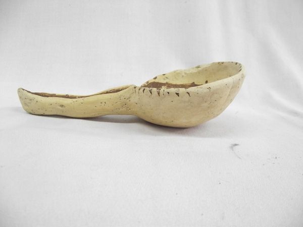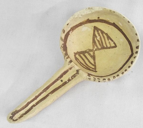 Prehistoric Jeddito Brown on Cream as found Ladle, measures approx. 7.25''L x 3.75''W x 2''D. As found condition, no over paint, cracks, glue, breaks and few chips. there is a couple of chips missing from rim of dipper. Very slight. Wonderful Bow Tie pattern in the bottom of the ladle in a large eye shape. There are hash marks on the rim of the dipper and two separate lines extening down an indenture in the ladle handle. Super find for the serious collector. From New Mexico Estate, acquired in accordance with all Federal and State Laws & Regulations.
