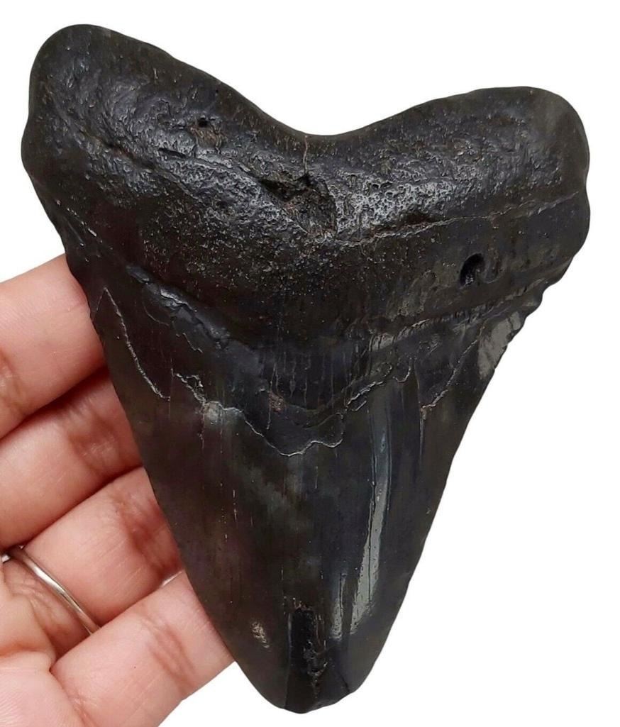 Large size 3.84" Prehistoric Megalodon Shark tooth fossil specimen. Natural dark color. No repair or restoration. 2-14 million years old. South Carolina river basin origin.Â