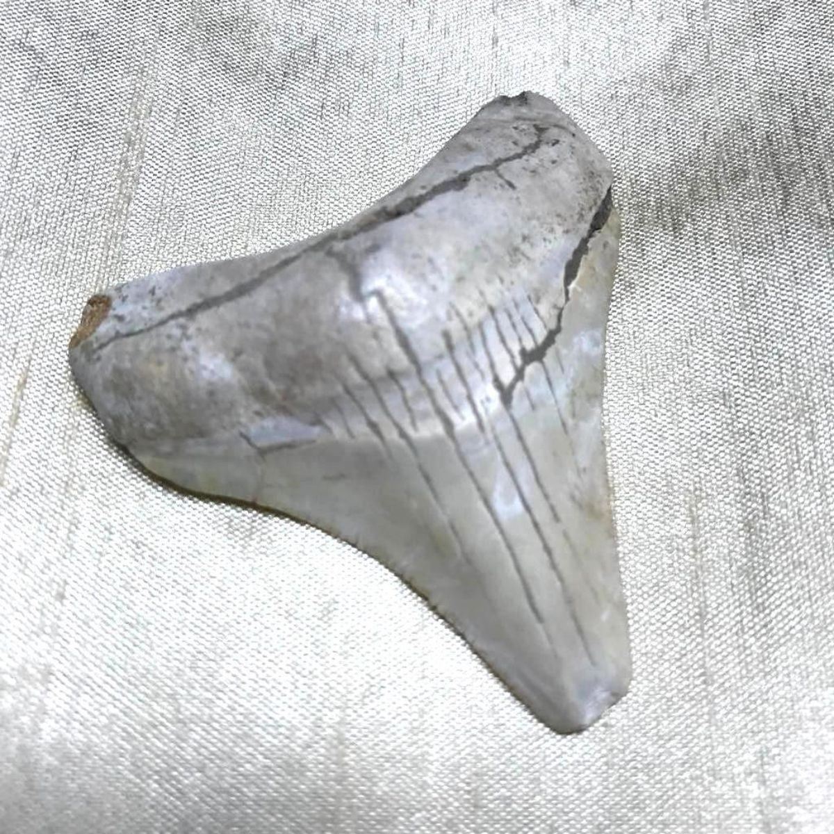 Prehistoric Megalodon Shark's Tooth, display artifact. 2"L X 2" W. White/gray enamel with white/gray gum material. Comes in museum-style display case.