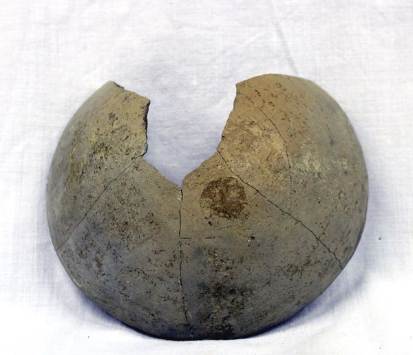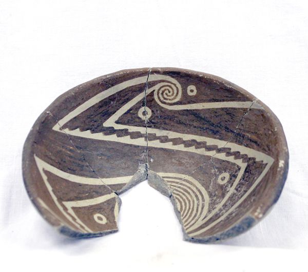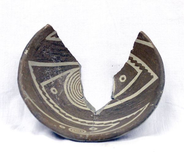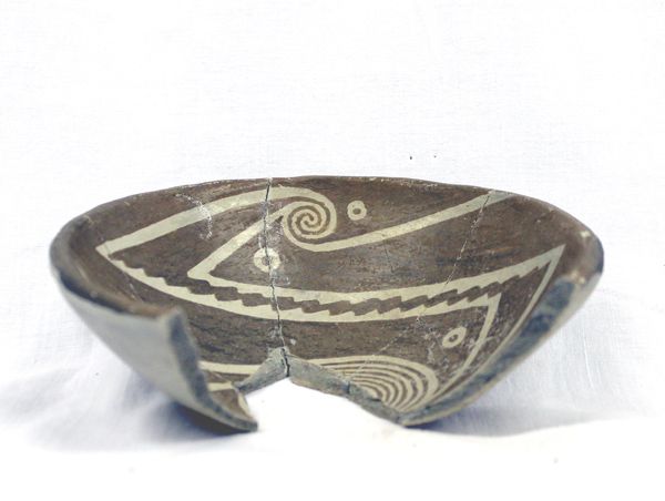 From a Silver City Private Collection we have a Prehistoric Mimbres Red on Buff Classic Picture Bowl, measures 2''H x 5.25''W, glued only, Big Horn Sheep's head with horns which runs into fish with animal in bowl, fishtail, circles around bowl, there are several pieces missing on one side, Big Horn Sheep's head is upside down and turns into an insect's probiscus , 4 eyes, 4 animals, there are two speech lines, no restoration, no glue, as found condition, comes with COA from owner, this piece has been in a private collection and has never sold or seen by the public, Acquired in accordance with all State and Federal Regulations