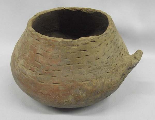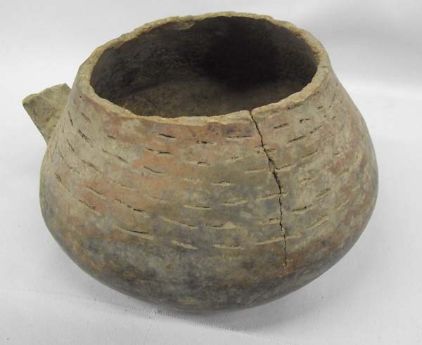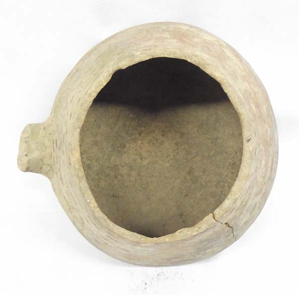Prehistoric Mimbres Utilitarian Pitcher. Measures approx. 4''H x 6 1/2''W. Bowl is traditionally hand coiled, pressure crack on one side, handle is missing, rim of pot is missing. IN Compliance with all State and Federal regulations. Buyers Pay Actual Shipping and Handling Charges(see terms and conditions for more information).