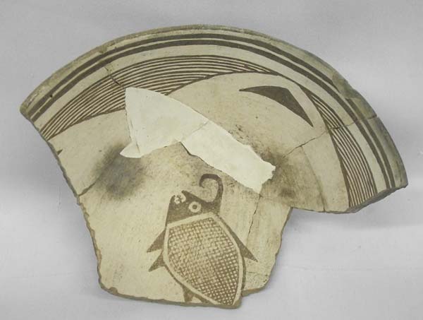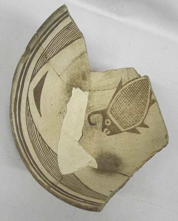 Prehistoric Mimbres Zoomorphic Partial Bowl. Measures approx. 4''H x 5''W. We are estimating that this is only about 1/4 the actual size of the bowl, and there has been restoration as shown in the picture. No overpaint, geometric pattern with a zoomorphic animal. The animal has a forked tongue, horn on the top and body of a fish. IN Compliance with all State and Federal regulations. Buyers Pay Actual Shipping and Handling Charges(see terms and conditions for more information).