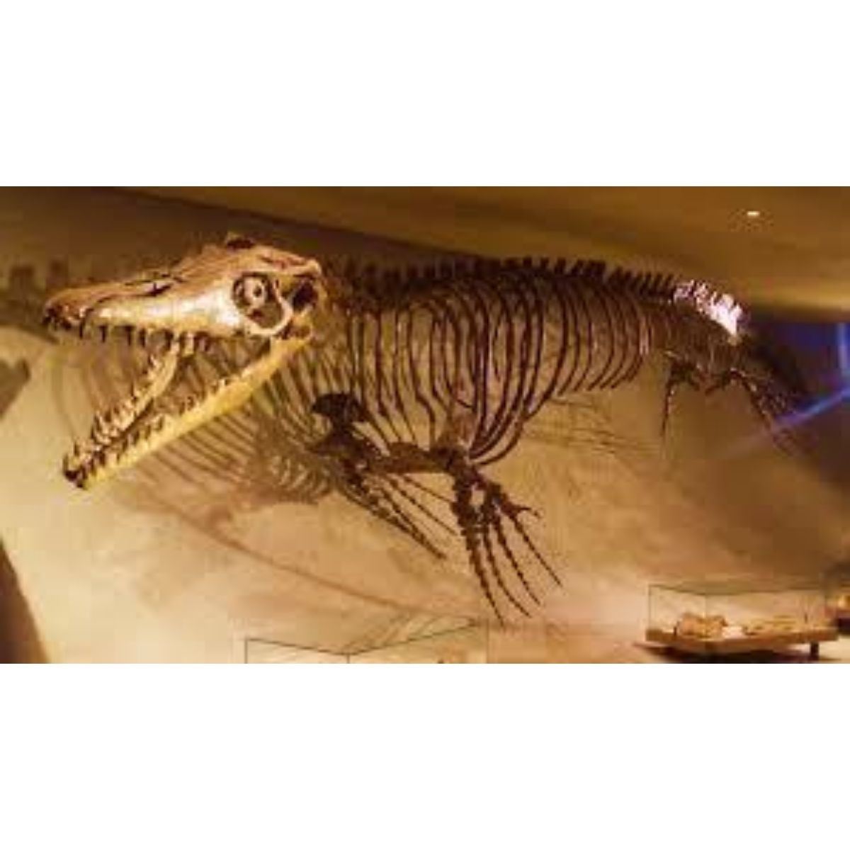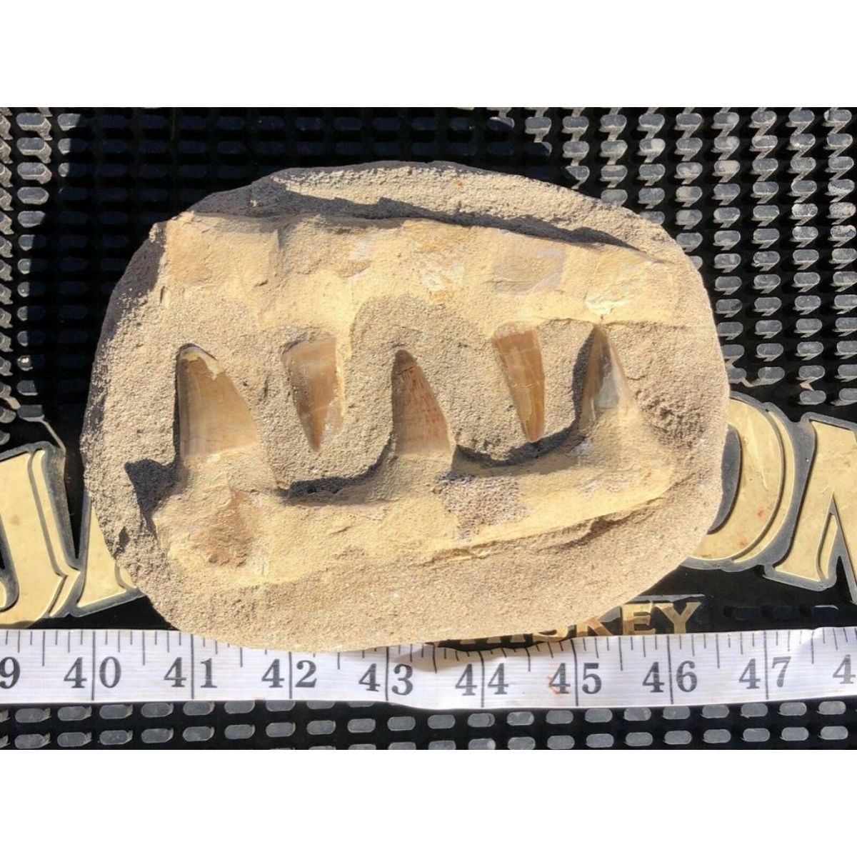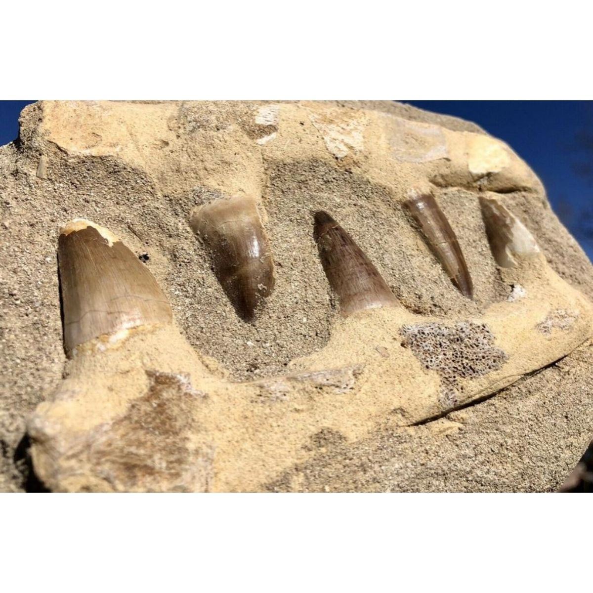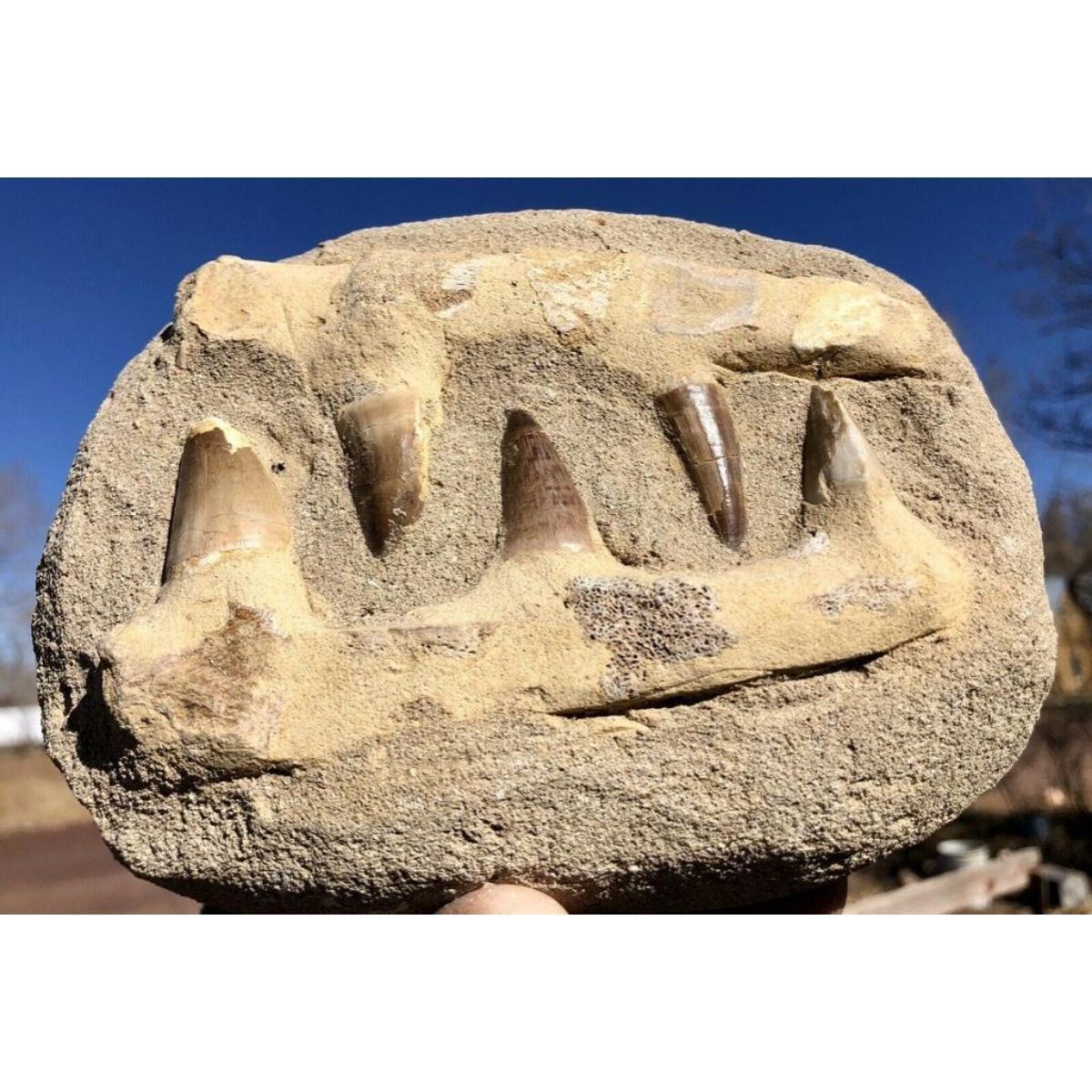 Prehistoric Mosasaur Dinosaur jaw section with teeth display fossil, with full root matrix. Measures 6 1/2". Globidens Mosasaur: Mosasaurs are an extinct group of large marine dinosaurs that probably evolved from an extinct group of aquatic lizards, aigialosaurs in the Early Cretaceous period, 100 million years ago, specifically during the last 20 million years of the Cretaceous period. After the extinction of ichthyosaurs & the decline of plesiosaurs, Mosasaurs became one of the most dominant marine predators. They breathed air & were powerful swimmers, living in the warm shallow inland seas during the Late Cretaceous & they gave birth to live young rather than returning to the shore to lay eggs. Mosasaurs ate mollusks, which were abundant in the Cretaceous seas, as well as fish, turtles & even sharks. They had double-hinged jaws & flexible skulls, resembling those of modern reptiles. Large mosasaurs were typically longer than 25 feet. Currently the largest Mosasaur skeleton in the world on display is just over 43 ft long. Â