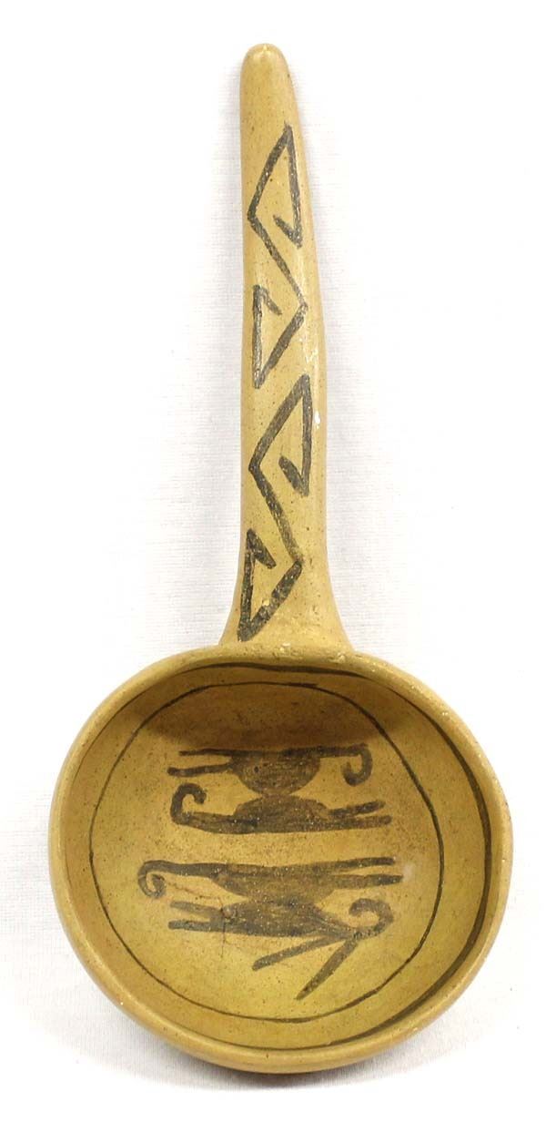 Prehistoric Native American Jeddito Pottery Ladle, measures 5''W x 12''L, some loss of paint, some minor pitting, some cracking, approximately 47% restoration, the handle has complete restoration, also completely repainted, professionally painted and restored, nice respresentation of a Jeddito ladle