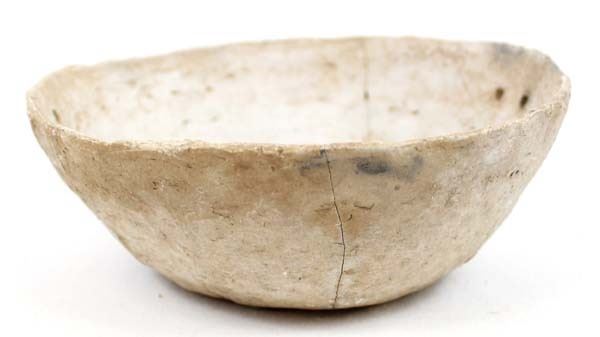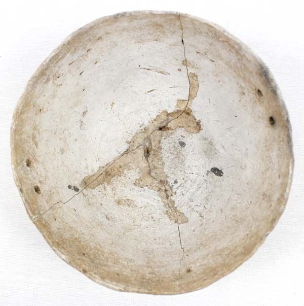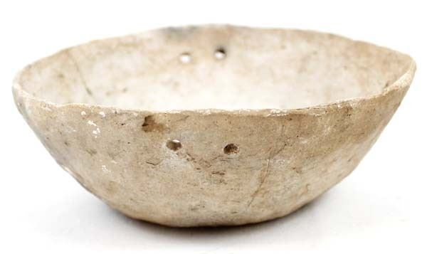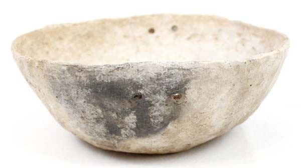 Prehistoric Native American Pottery Bowl, measures 2.5''H x 6.5''D, has opposing drilled holes in sides, Acquisition is in compliance with all state and federal regulations.