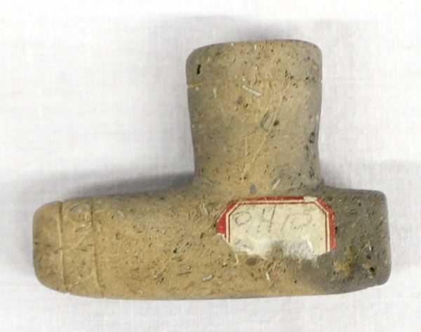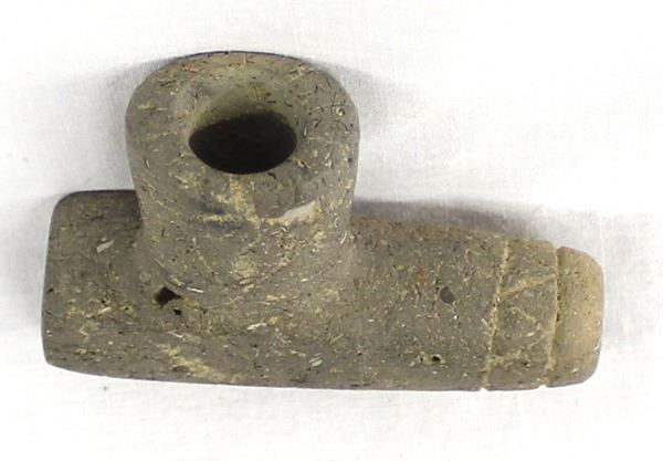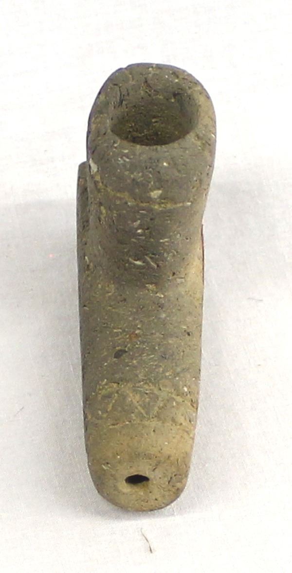Prehistoric Native American Pottery Clay Pipe, measures 2'' x 2.75'' x .75'', carved lines and designs, Acquisition is in compliance with all state and federal regulations.