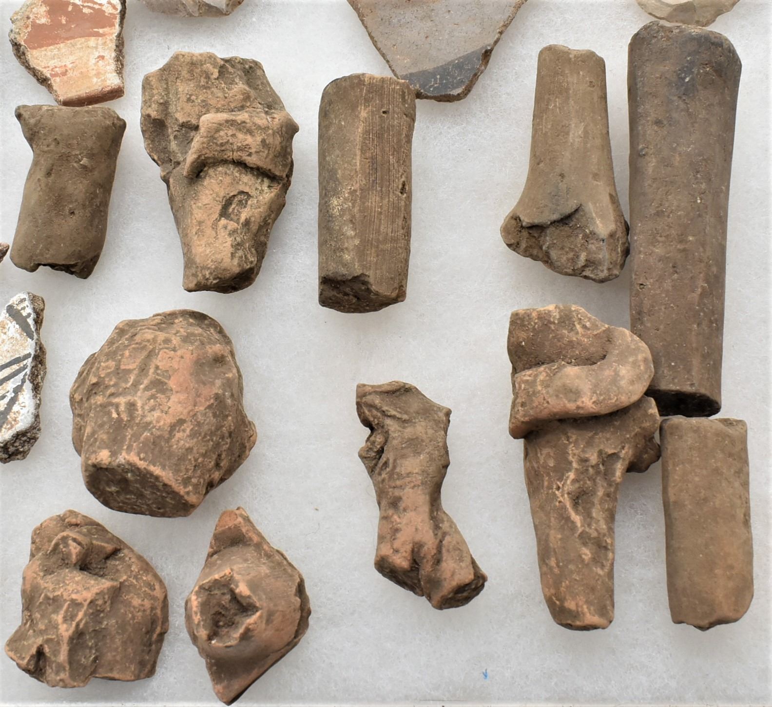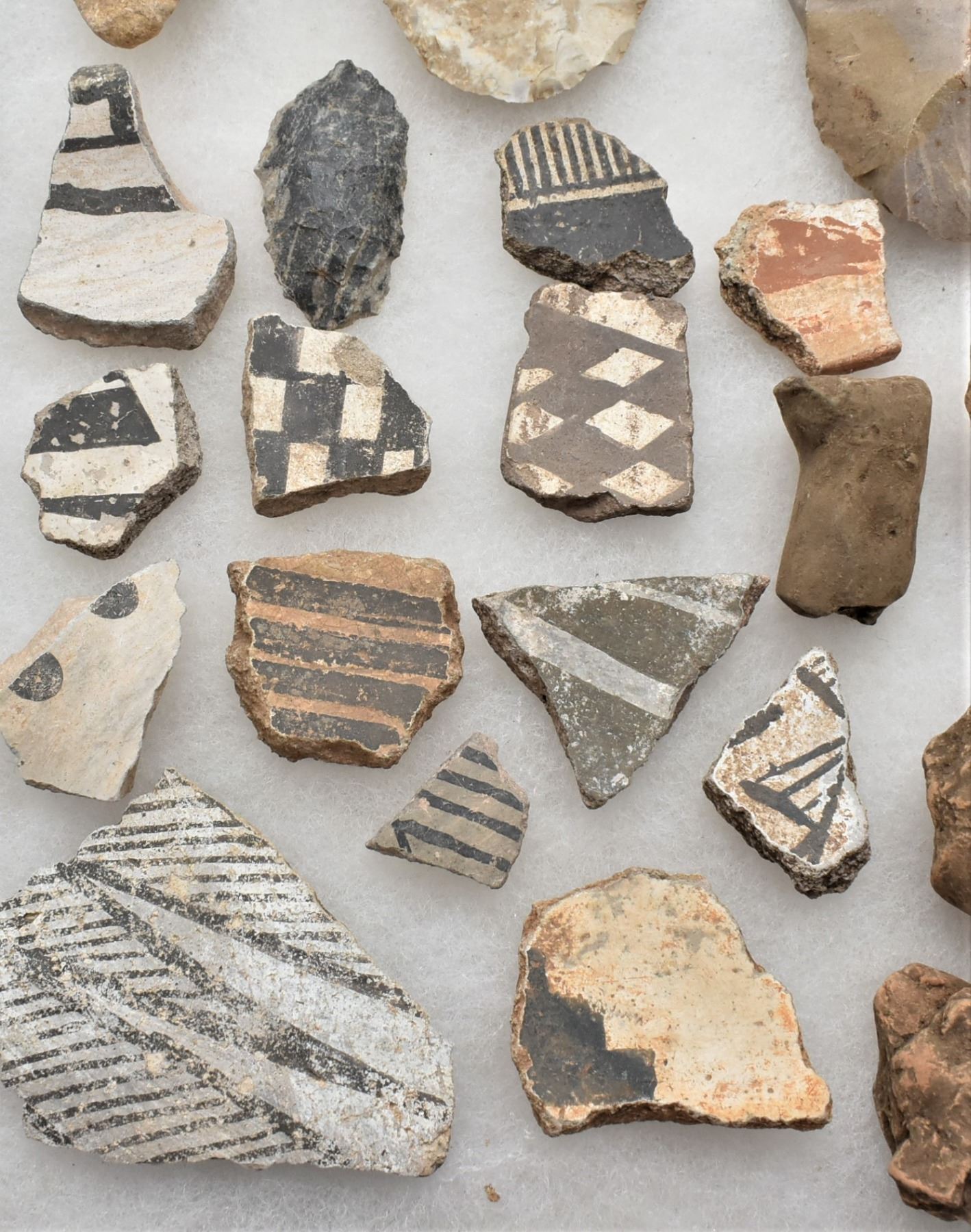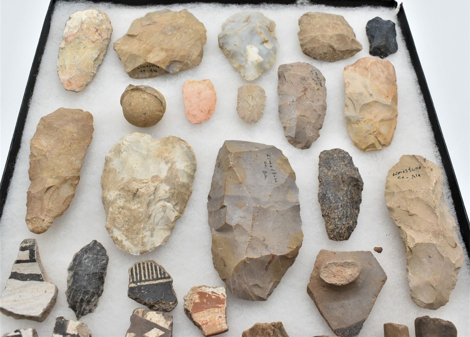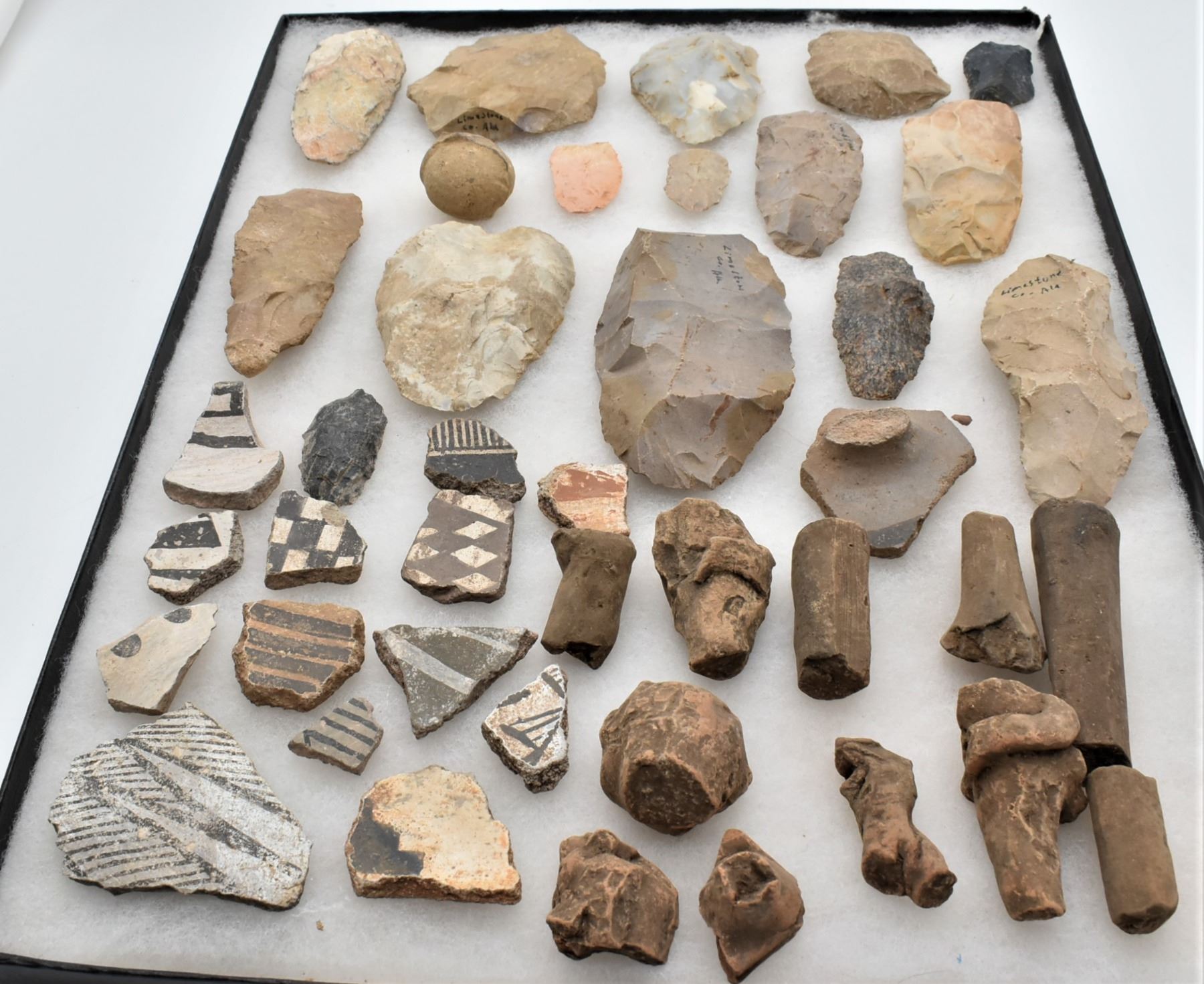 Prehistoric Native American Stone Tools, Flint, Arrowheads, Sherds, and PreColumbian Pottery Handle Remnants, largest measures 4-5''L