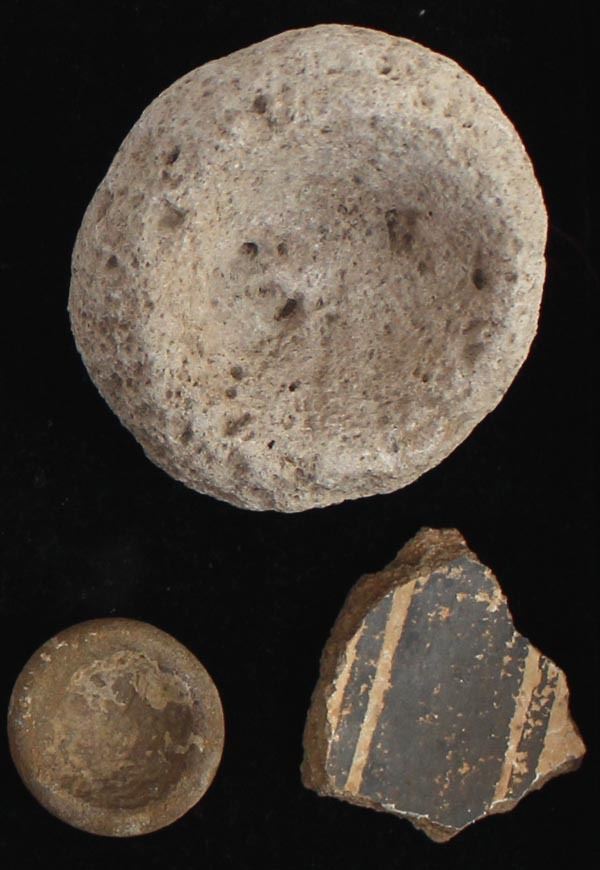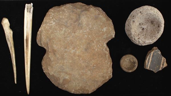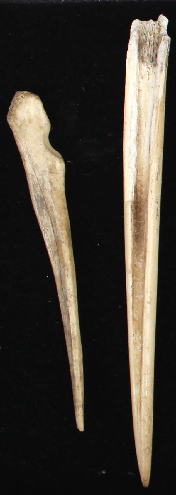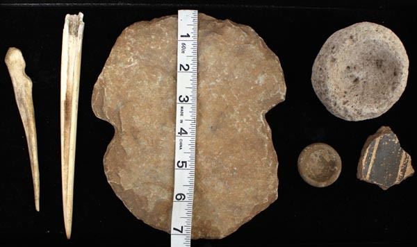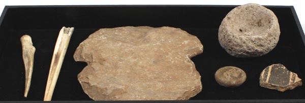 Prehistoric Native American Stone and Bone Tools Plus, includes Mortar 3'', Hoe Scraper 7x5'', Paint Bowl 1'', Pot '' & 5'', Sherd, Two Awls one is 7'' & one is 5''.