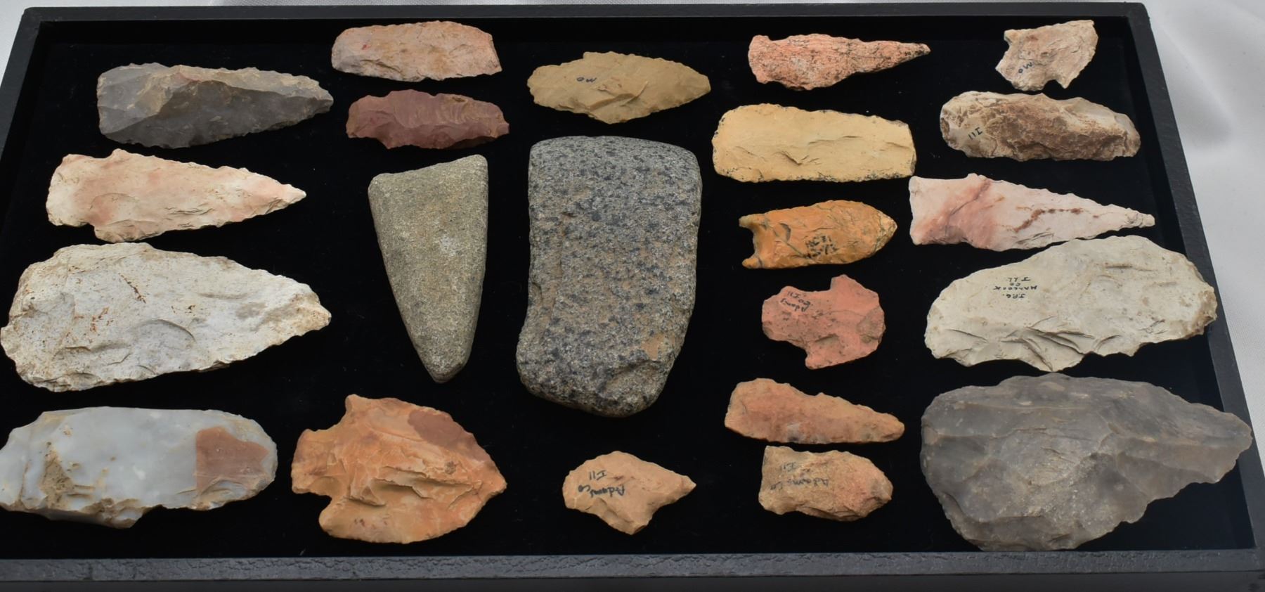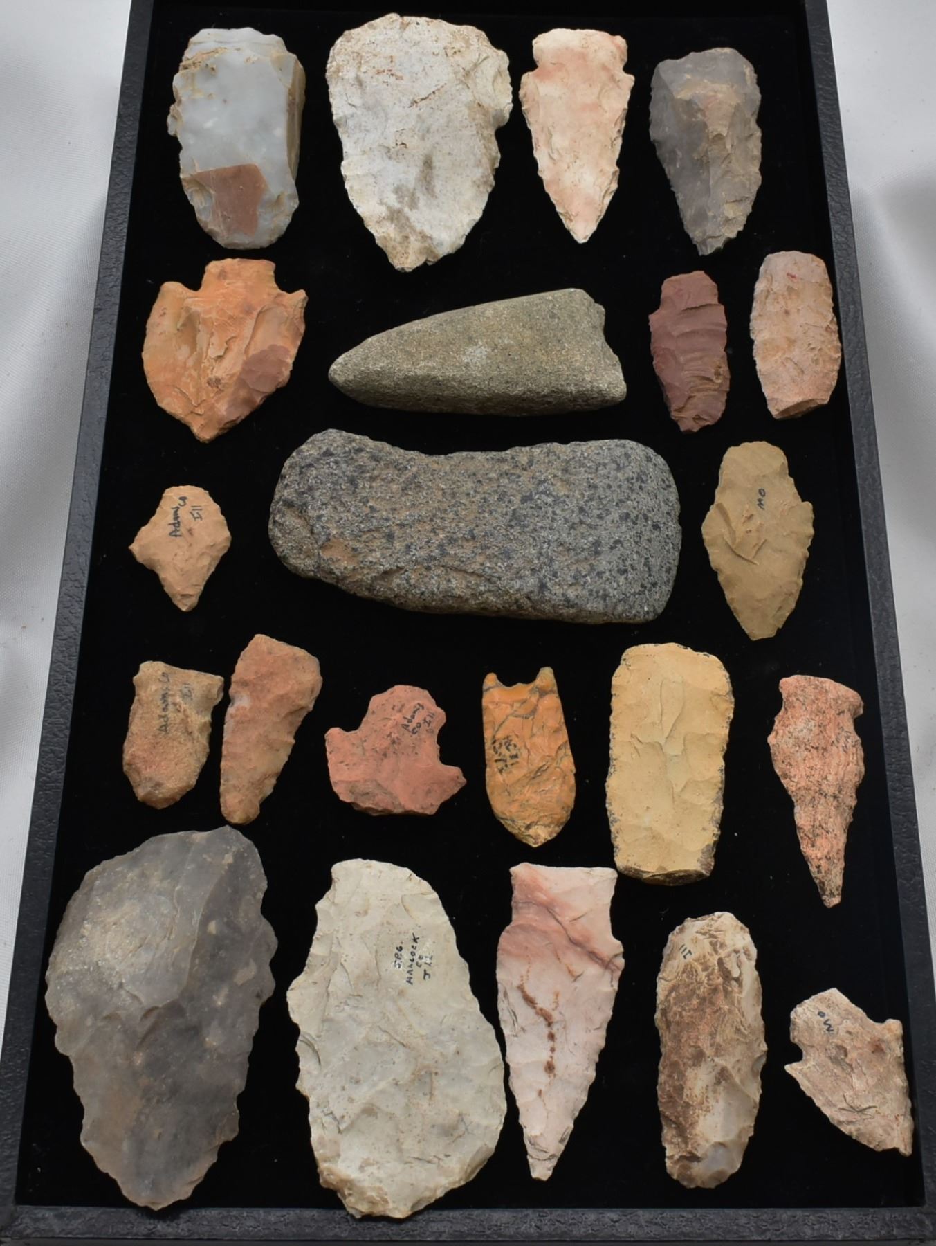 Prehistoric Native American Stone Tools and Arrowheads, largest measures 4'' x 2'', from Adams County Illinois, Hancock County Illinois, Arkansas, Limestone County Alabama, and Missouri, 22 pieces total