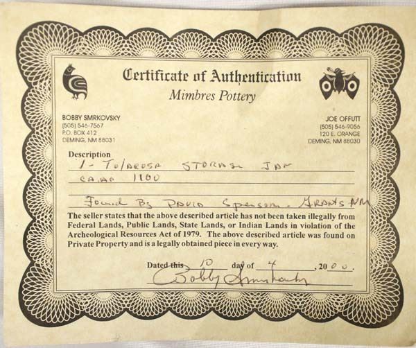 Prehistoric Native American Tularosa Pottery Water Storage Olla, measures 13'' x 14'' and comes with the stand, ca. AD 1100, comes with COA, Acquisition is in compliance with all state and federal regulations.