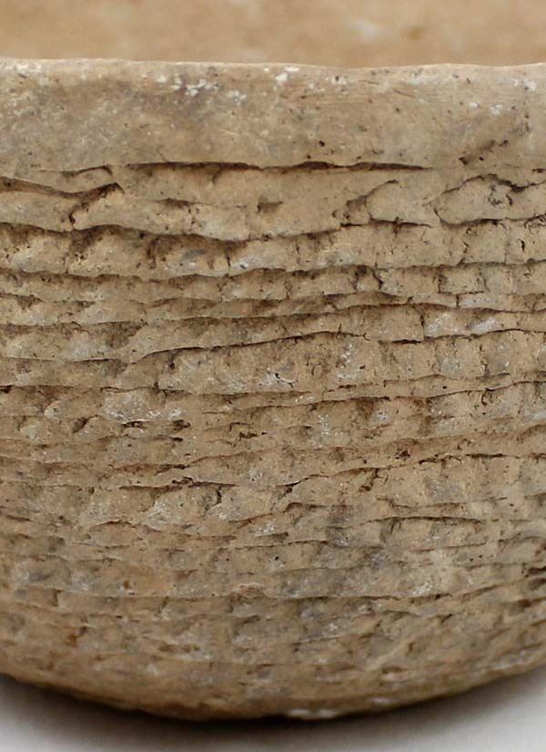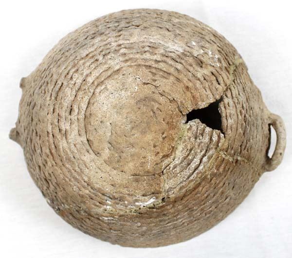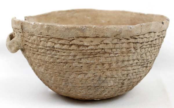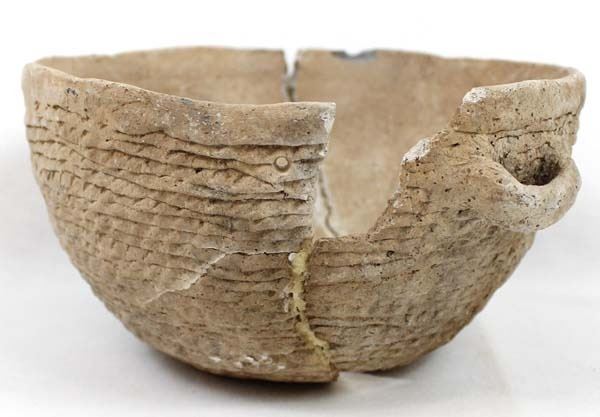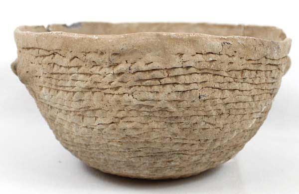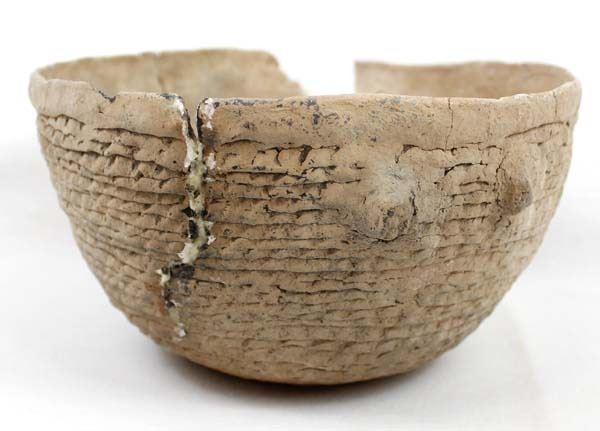 Prehistoric Native American Utilitarian Pottery Bowl, measures 7'' x 4'', corrugated pottery, has been glued, however not professionally, missing 2 pieces