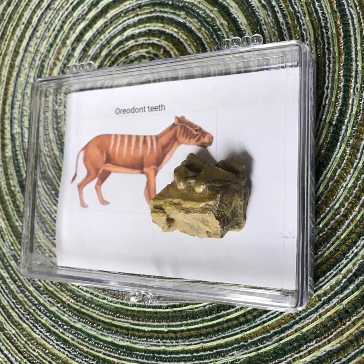 Prehistoric artifact, fossil teeth from an extinct genus of early pig or hog, Merycoidodontoidea, sometimes called "oreodonts" or "ruminating hogs", is an extinct superfamily of prehistoric cud-chewing artiodactyls with short faces & fang-like canine teeth. First appearing 48 million years ago. Approx 1" fossil in 2 1/2" X 3 1/2" display case.