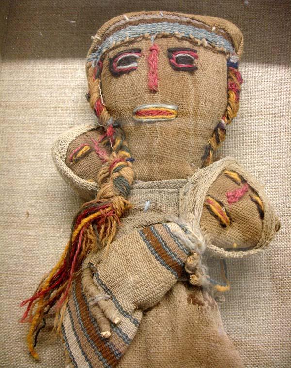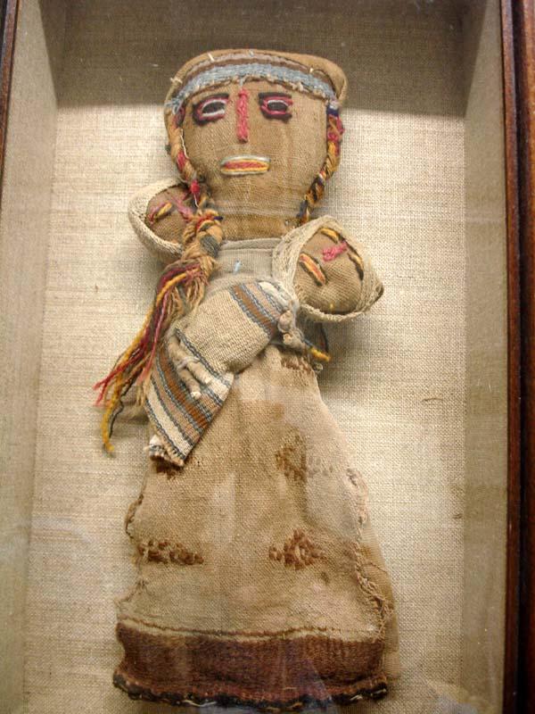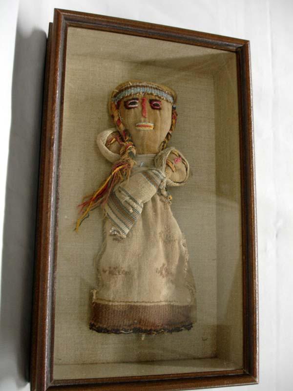 Prehistoric Peruvian Cloth Doll in Frame Box, Under Glass. The cloth doll measures 10'' long and the wood frame is 14.5''x9''x3.25''. Buyers Pay Actual Shipping and Handling Charges(see terms and conditions for more information).
