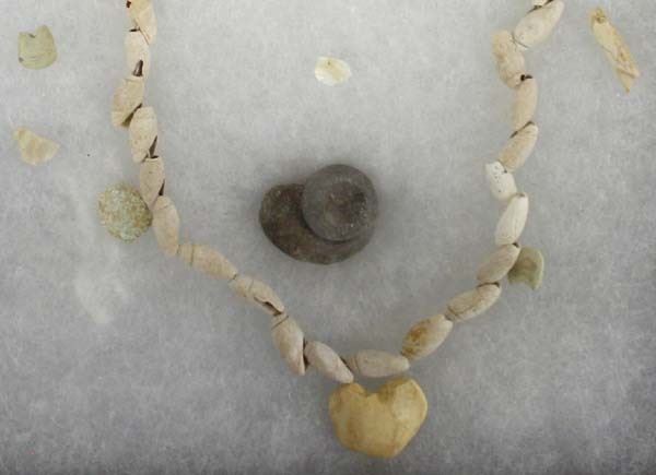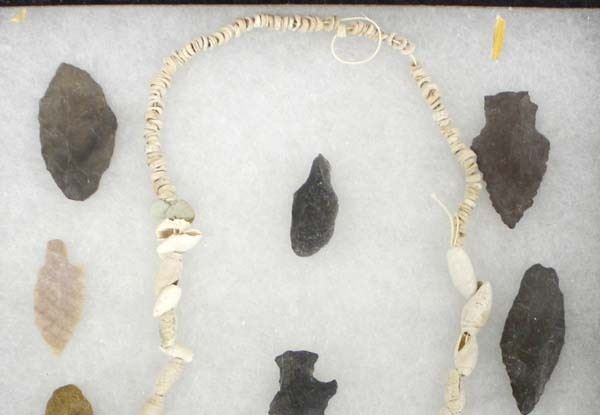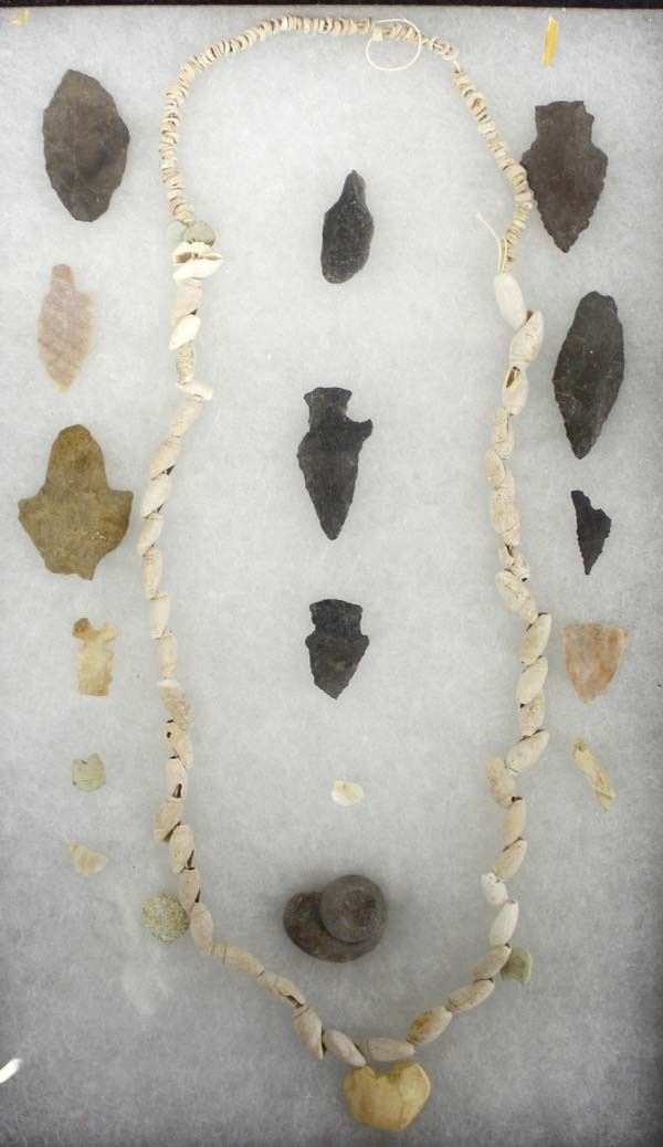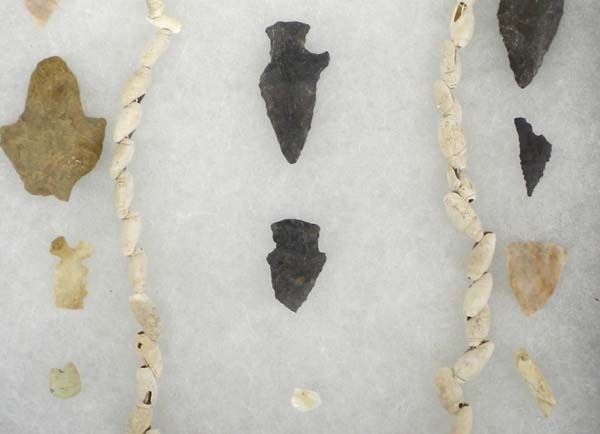 Prehistoric New Mexico Shell Bead Necklace and Stone Arrowheads, longest arrowhead measures 1.5''L and necklace measures 20''L end to end, Acquisition is in compliance with all state and federal regulations.