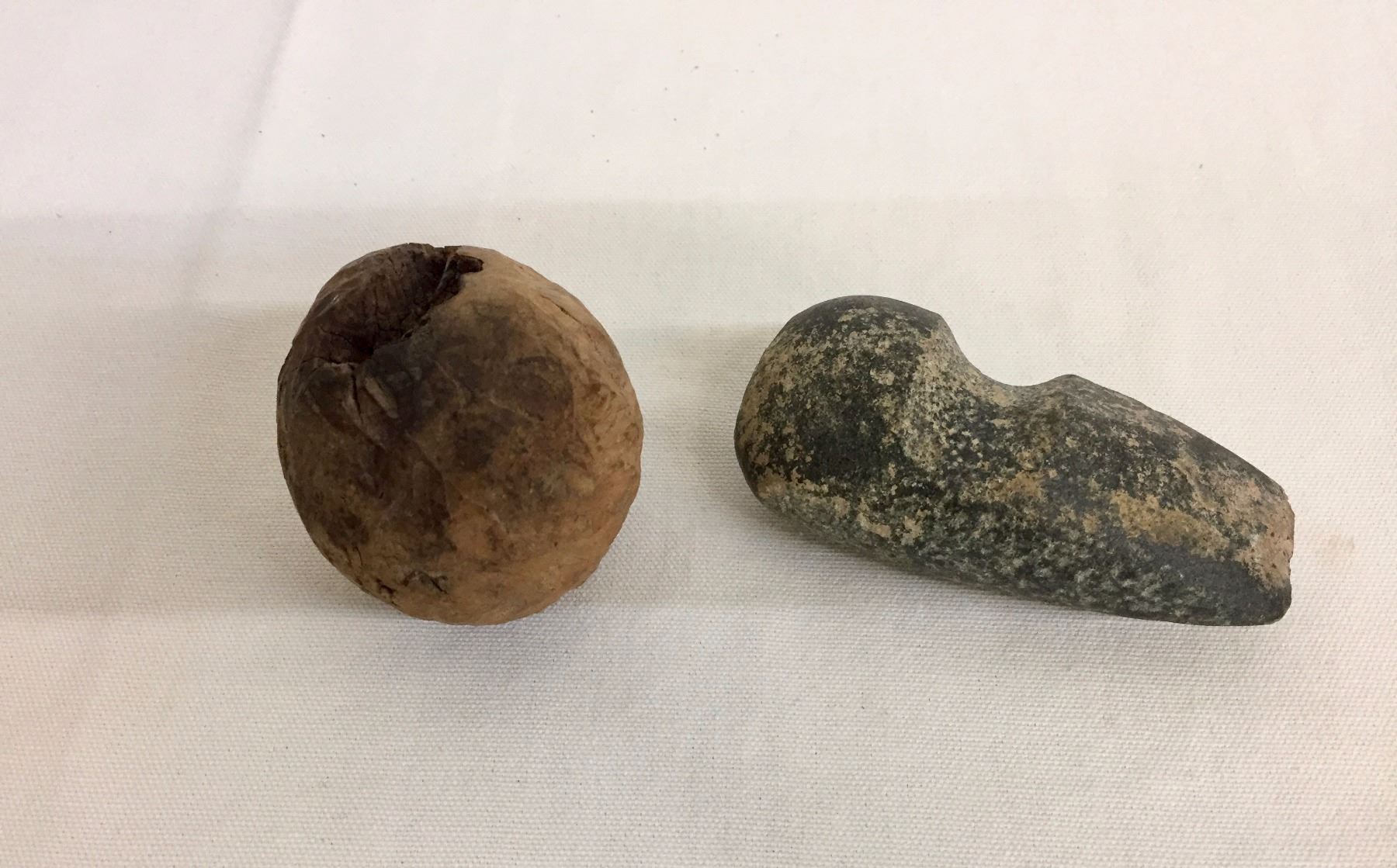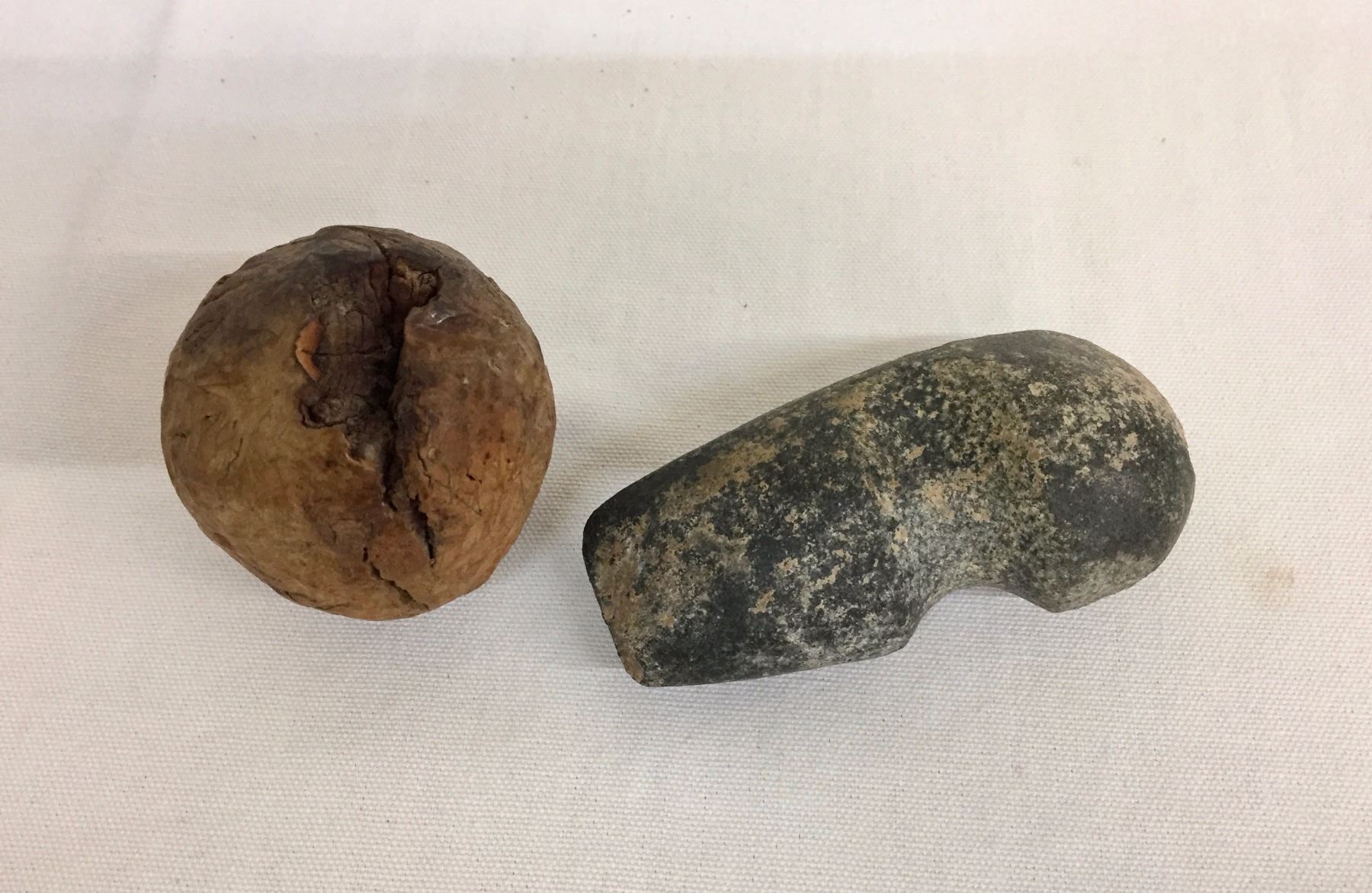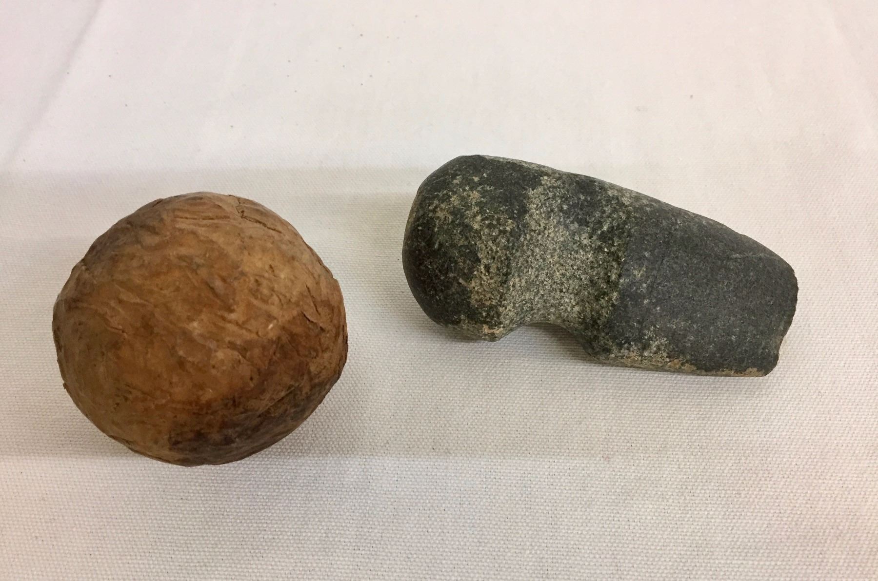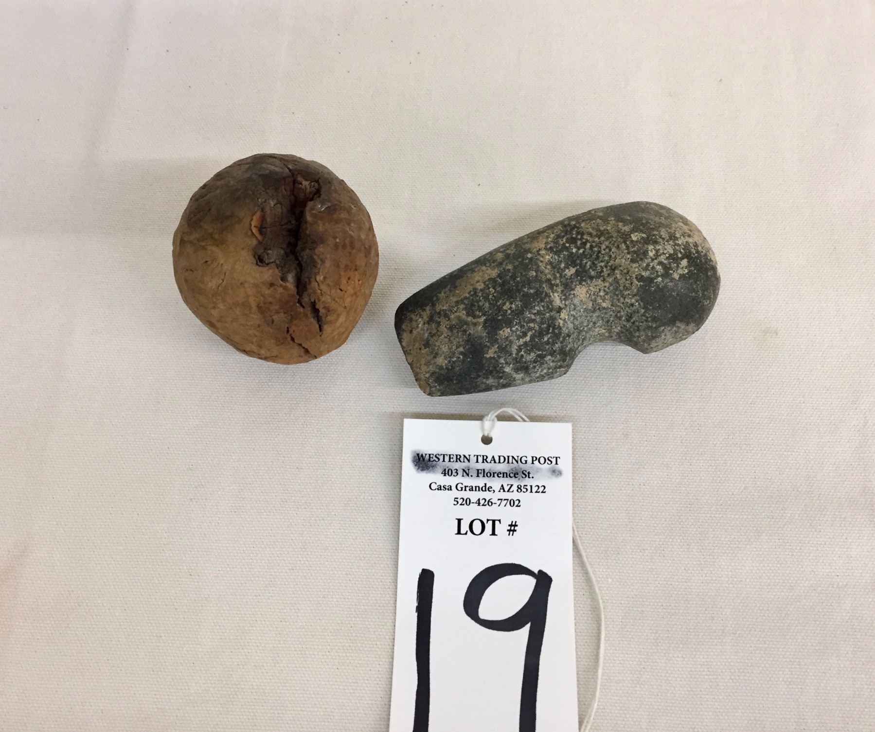 Description: 2 prehistoric artifacts, including a stone axe head. Maker: Unknown. Approx. Age: Prehistoric. Size: Axe head is 2” w x 3 7/8” l and the artifact is 7 3/4”. Condition: Pretty good for its age. Please look closely at the pictures - they are an important part of our description. Shipping: There will be a $5 handling / packaging fee for shipping this lot. The actual cost of postage will be added on top of that.