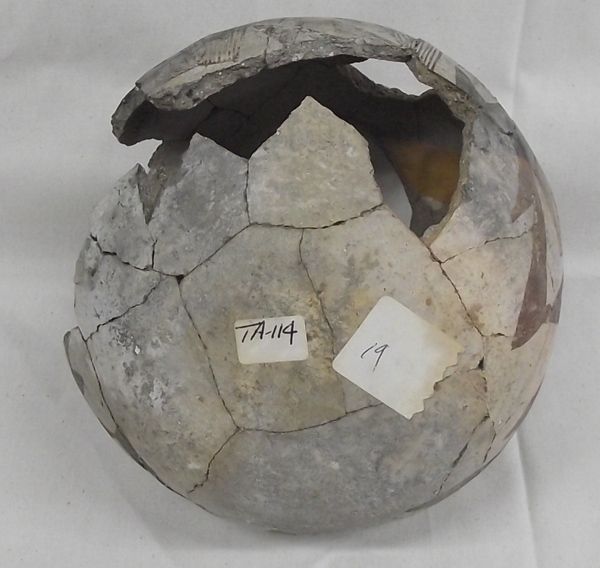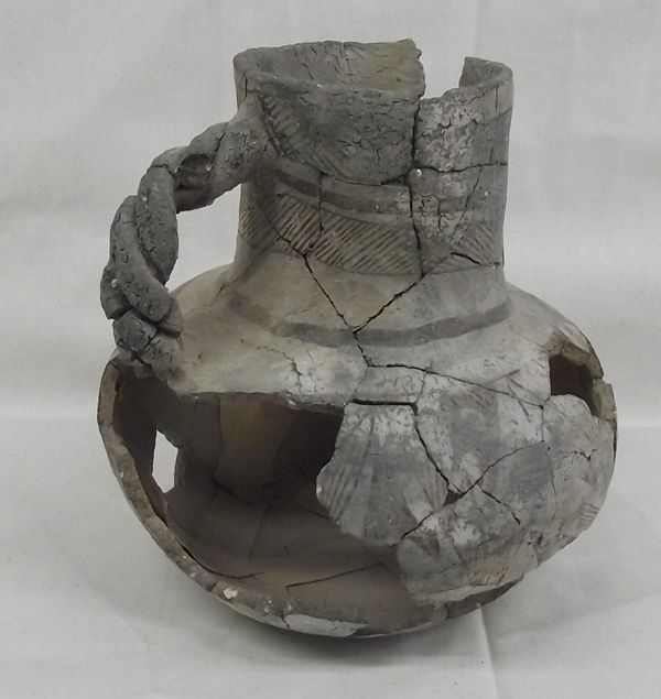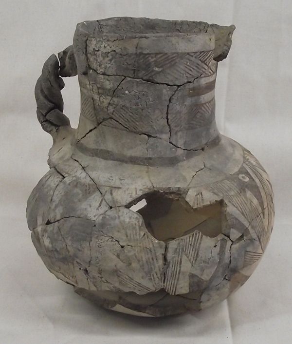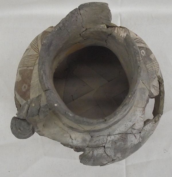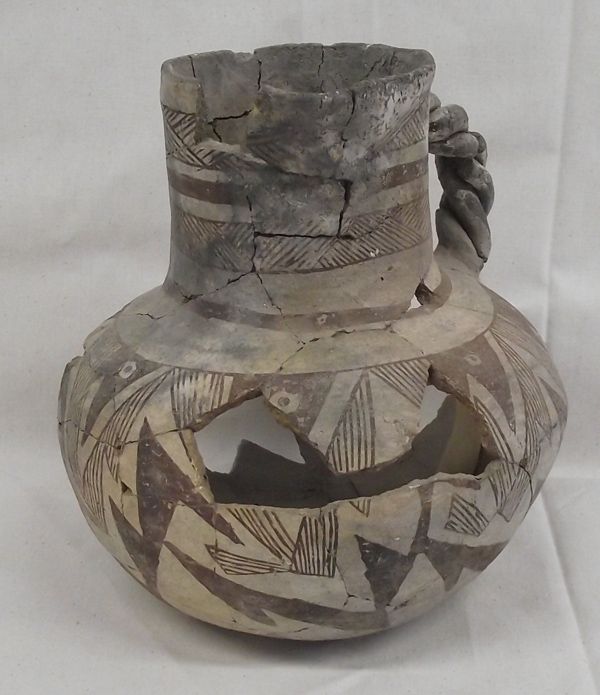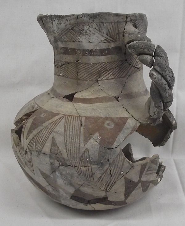 Prehistoric Tularosa Blk on White Pottery Pitcher, measures approx. 7.5''H x 7''W. Five Parrot Heads all around the outside of the bowl. There were six parrot heads, however, one is missing. Braided Handle, has been glued (not professionally glued). Acquired in accordance with all Federal & State Laws and Regulations.