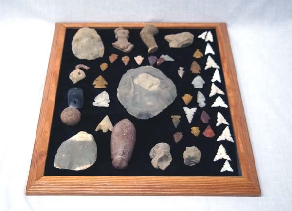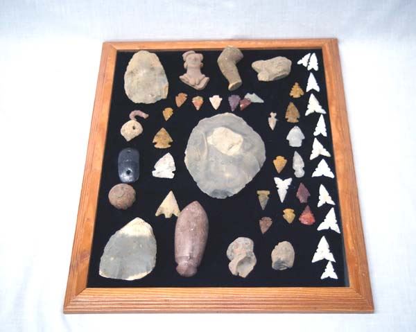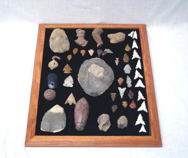 Prehistoric and Contemporary Native American Artifacts, largest measures 5''L x 3.5'', includes original prehistoric stone tools, some prehistoric arrowheads, some contemporary, PreColumbian Pottery Throw Replicas, gorget, and plummet stone