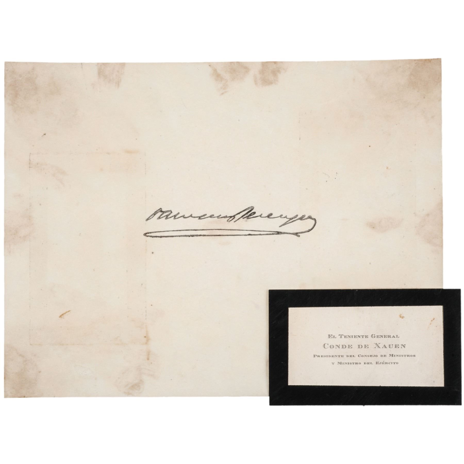 Autograph Signature on a large sheet on heavy tan paper, measuring 8.75” x 6.75” and boldly signed “DAMASCO BERENGUA”measuring 3.5” across. Some scattered general tone and light stains around the outer marginal edges, otherwise Fine.