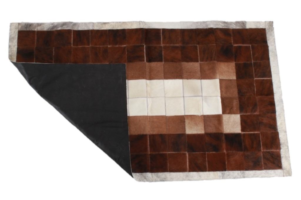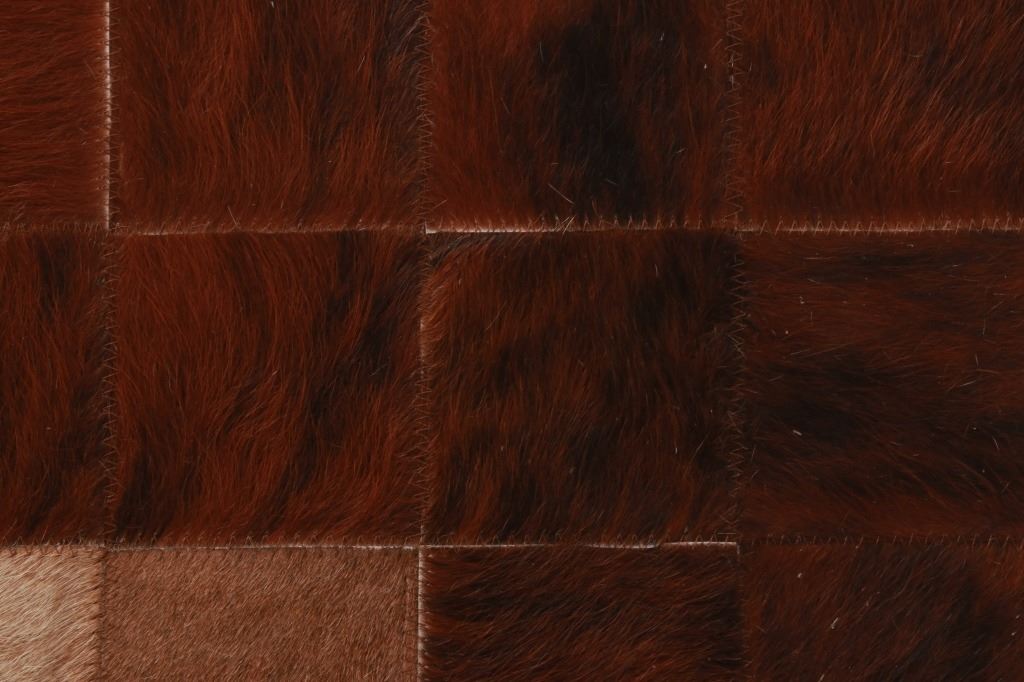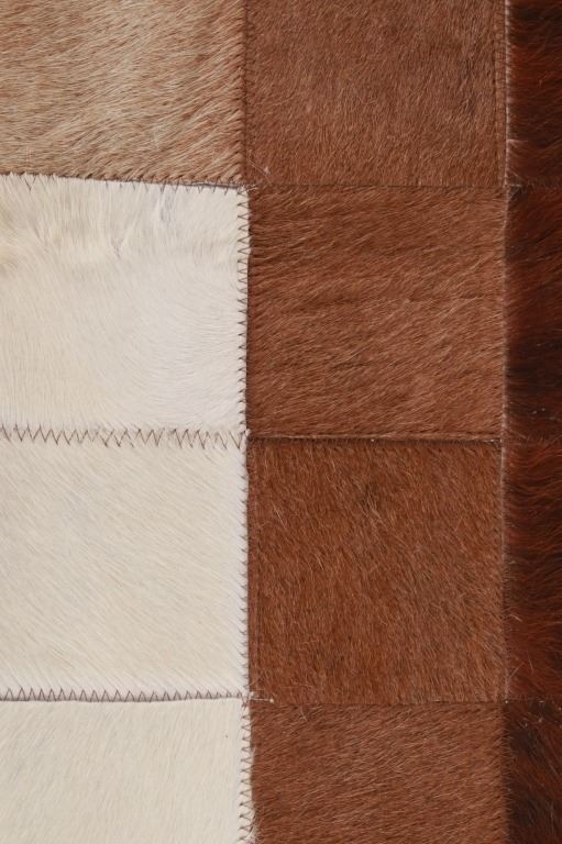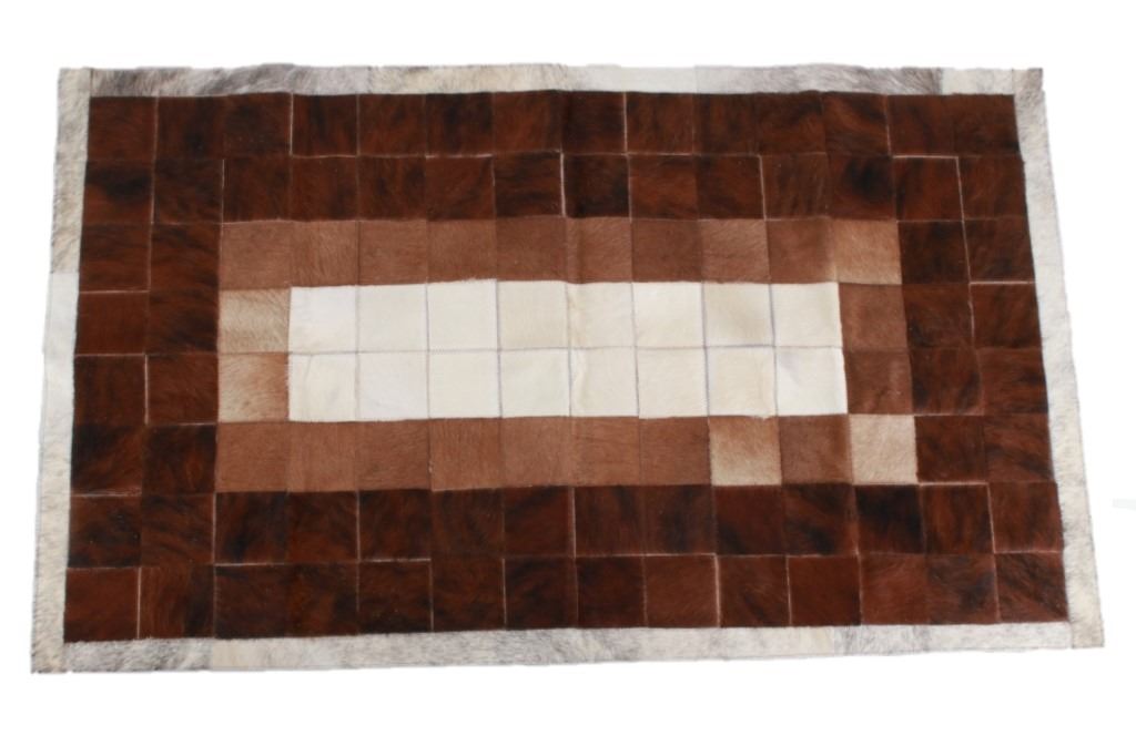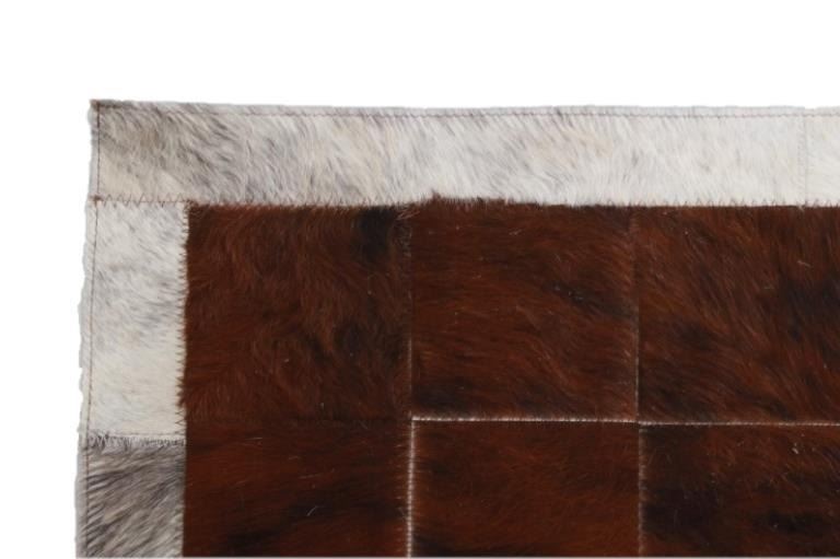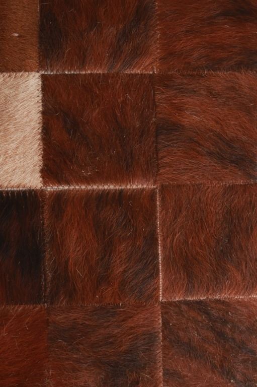 This is an excellent, premium cowhide patchwork quilt blanket with 4" x 4" square cowhide segments of numerous different types of cowhide including striped dark brown brindle, light brown, speckled white brindle, and Charolais. Some of the cowhide segments include the most desired and shows the highest quality with this example featuring a wide variety of breeds and colors to the blanket. Cowhide (also referred to as cow hide, steerhide, steer hide) is a brand-new example, being professionally tanned and in pristine condition. The cowhide patchwork quilt is considered Large (L) size, being 5 foot long 3 foot wide. 5' x 3'.