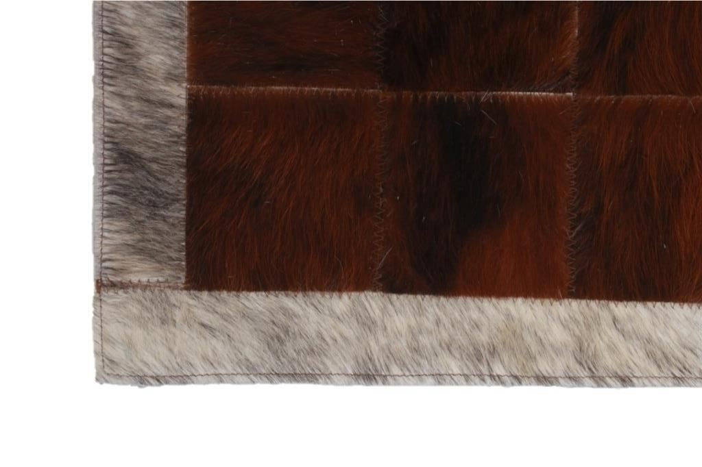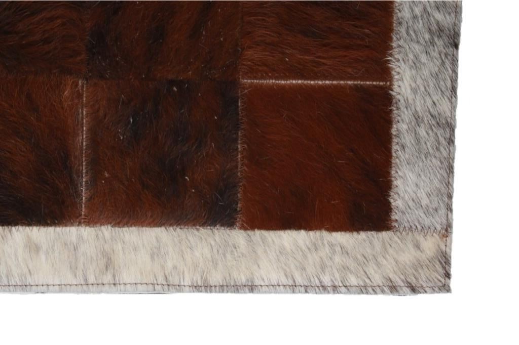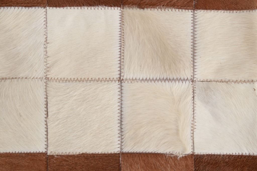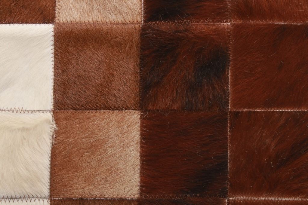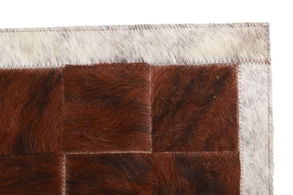 This is an excellent, premium cowhide patchwork quilt blanket with 4" x 4" square cowhide segments of numerous different types of cowhide including striped dark brown brindle, light brown, speckled white brindle, and Charolais. Some of the cowhide segments include the most desired and shows the highest quality with this example featuring a wide variety of breeds and colors to the blanket. Cowhide (also referred to as cow hide, steerhide, steer hide) is a brand-new example, being professionally tanned and in pristine condition. The cowhide patchwork quilt is considered Large (L) size, being 5 foot long 3 foot wide. 5' x 3'.