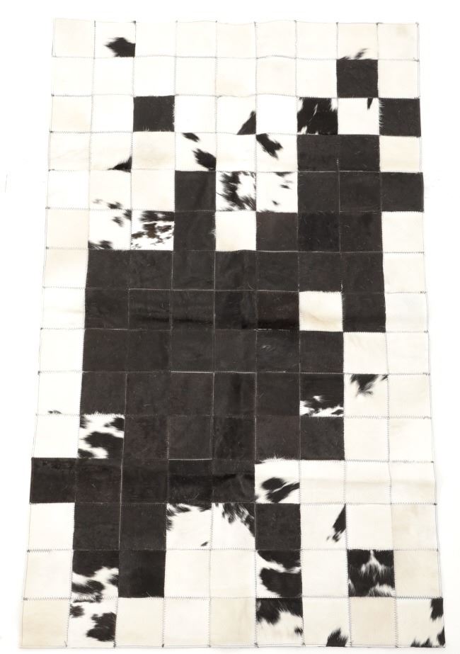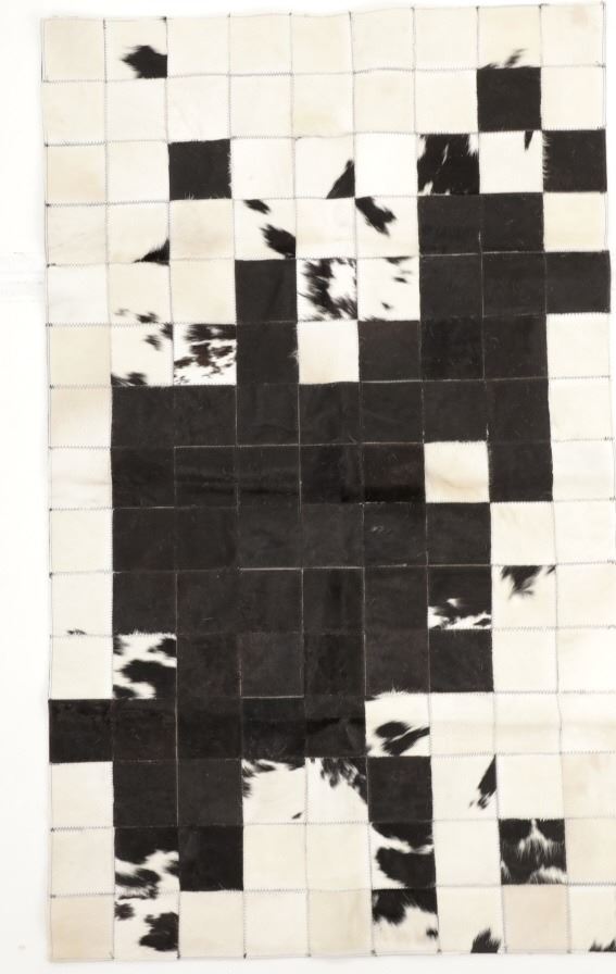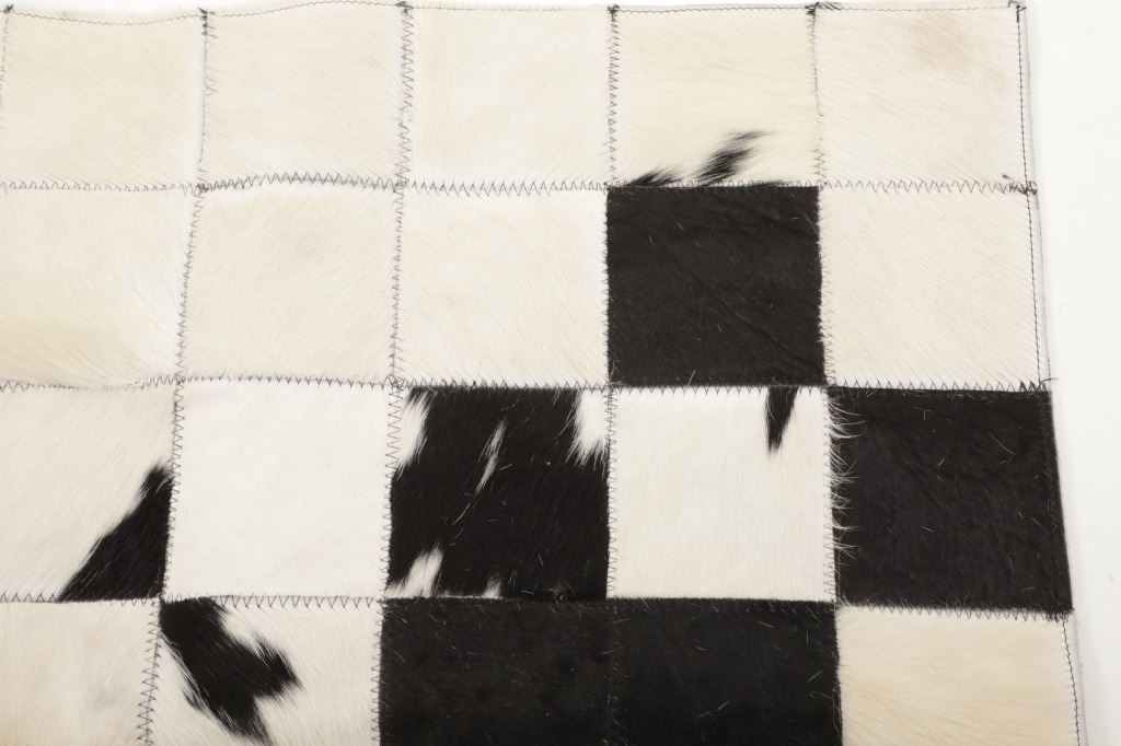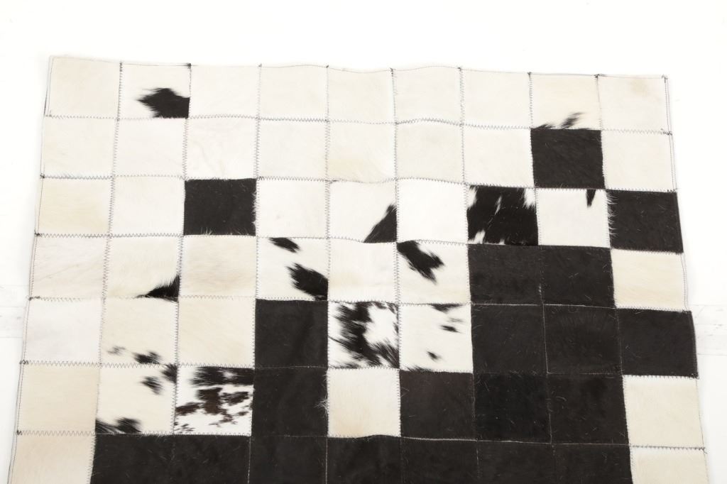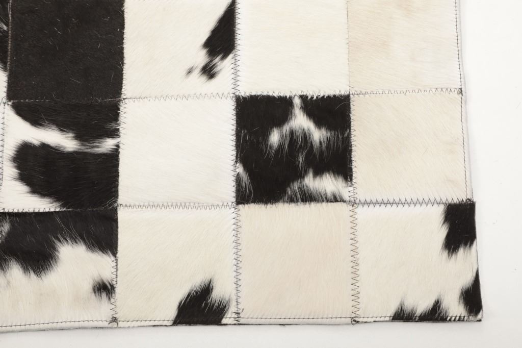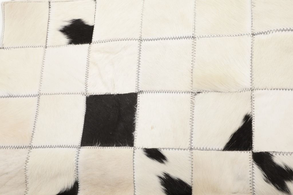 This is an excellent, premium cowhide patchwork quilt blanket with 4" x 4" square cowhide segments of numerous different types of cowhide including white and black Holstein coloration to the segmented squares. Some of the cowhide segments include the most desired and shows the highest quality with this example featuring a wide variety of breeds and colors to the blanket. Cowhide (also referred to as cow hide, steerhide, steer hide) is a brand-new example, being professionally tanned and in pristine condition. The cowhide patchwork quilt is considered Large (L) size, being 5 foot long 3 foot wide. 5' x 3'.