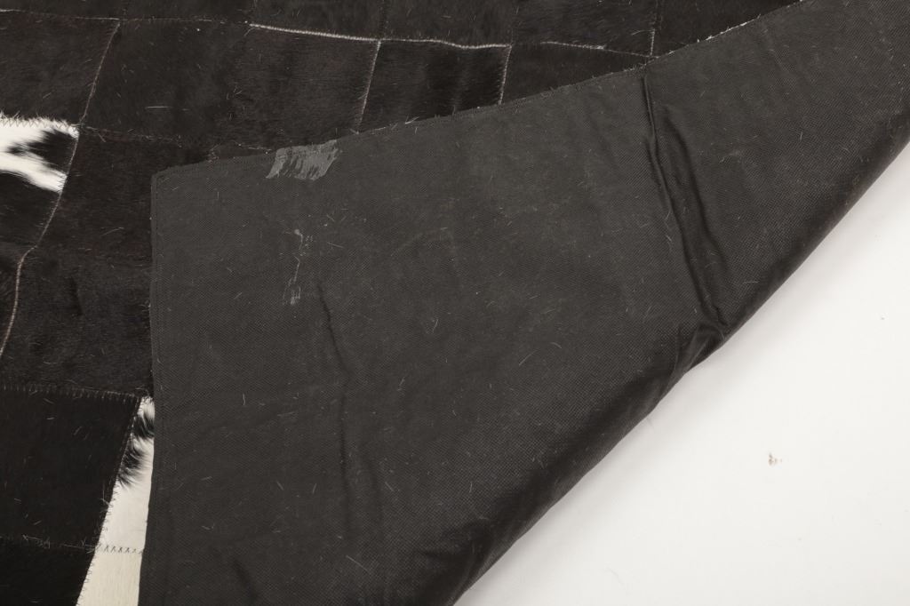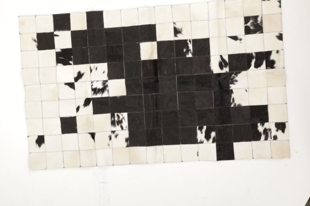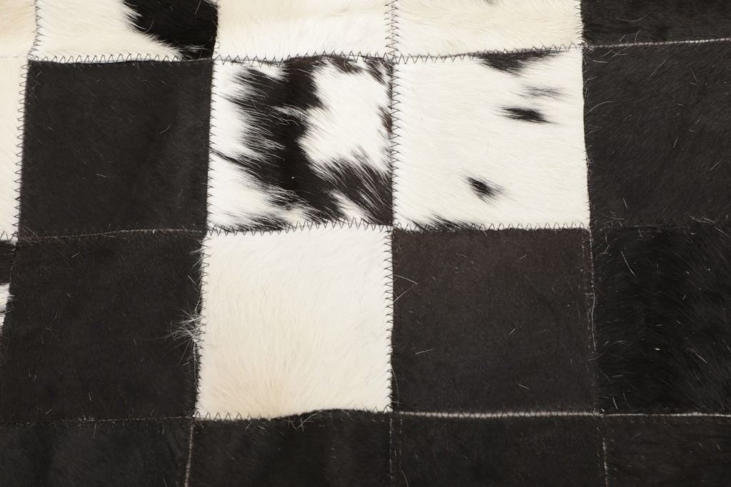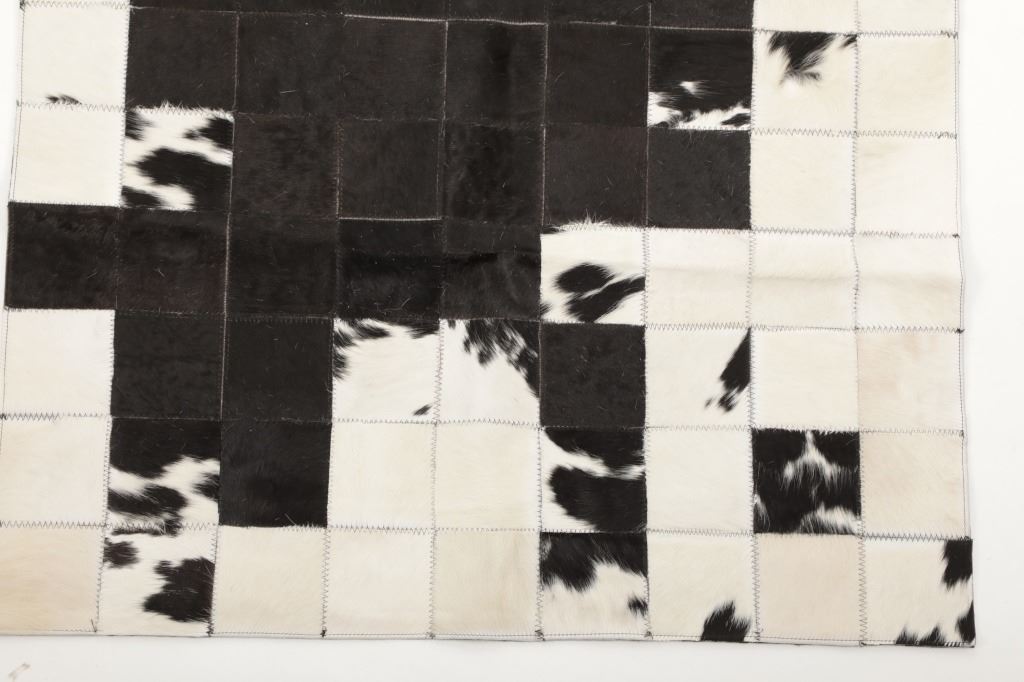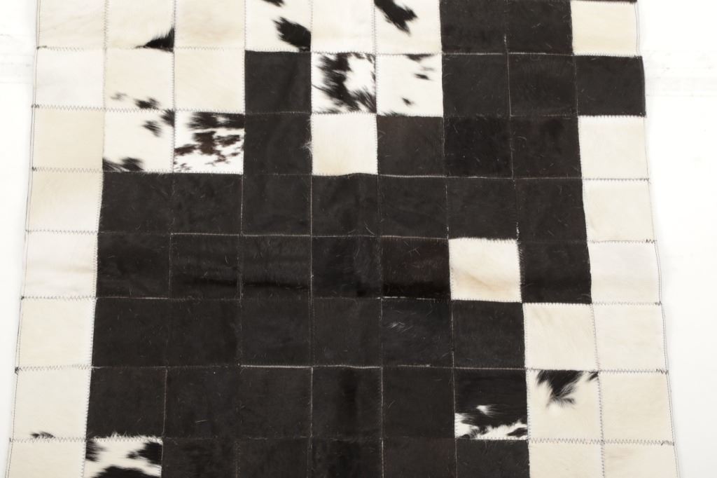 This is an excellent, premium cowhide patchwork quilt blanket with 4" x 4" square cowhide segments of numerous different types of cowhide including white and black Holstein coloration to the segmented squares. Some of the cowhide segments include the most desired and shows the highest quality with this example featuring a wide variety of breeds and colors to the blanket. Cowhide (also referred to as cow hide, steerhide, steer hide) is a brand-new example, being professionally tanned and in pristine condition. The cowhide patchwork quilt is considered Large (L) size, being 5 foot long 3 foot wide. 5' x 3'.