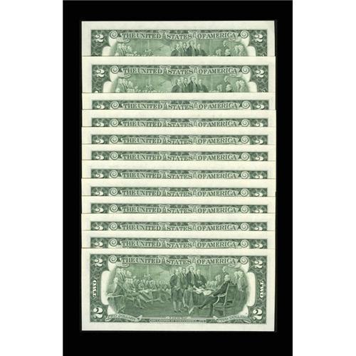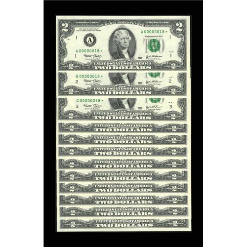 <B>Premium Federal Reserve $2 Set Series 2003 Fr. 1937-A*-L* $2 2003 Federal Reserve Notes. Gem Crisp Uncirculated.</B></I><BR>This is a fantastic set of Stars all carrying serial number 00000018*. This is the lowest serial number we have seen for Deuces in this format. This collection is also housed in a 24 page booklet.