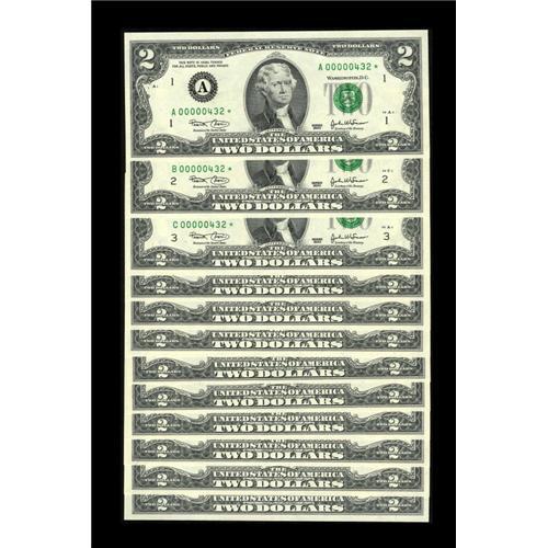 <B>Premium Federal Reserve $2 Set Series 2003 Fr. 1937-A*-L* $2 2003 Federal Reserve Notes. Choice Crisp Uncirculated.</B></I><BR>This collection of Stars is housed in a 24 page booklet. Also, each note has serial number 00000432*. Centering issues on the notes determined the grade. Only 2,000 sets were produced and this set took only hours to sell out.<BR><BR><b>Shipping:</b> Coin/Currency (<a target="_blank" href="http://www.heritageauctions.com/common/shipping.php">view shipping information</a>)