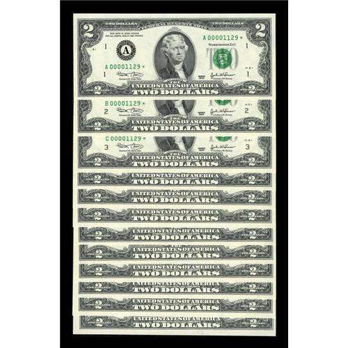 <B>Premium Federal Reserve $2 Set Series 2003 Fr. 1937-A*-L* $2 Federal Reserve Notes. Choice Crisp Uncirculated.</B></I><BR> This collection of Stars is housed in a 24 page booklet. Also, each note has serial number 000001129*. Only 2000 sets were produced and this set took only hours to sell out.<BR><BR><b>Shipping:</b> Coins & Currency (<a target="_blank" href="http://www.heritageauctions.com/common/shipping.php">view shipping information</a>)