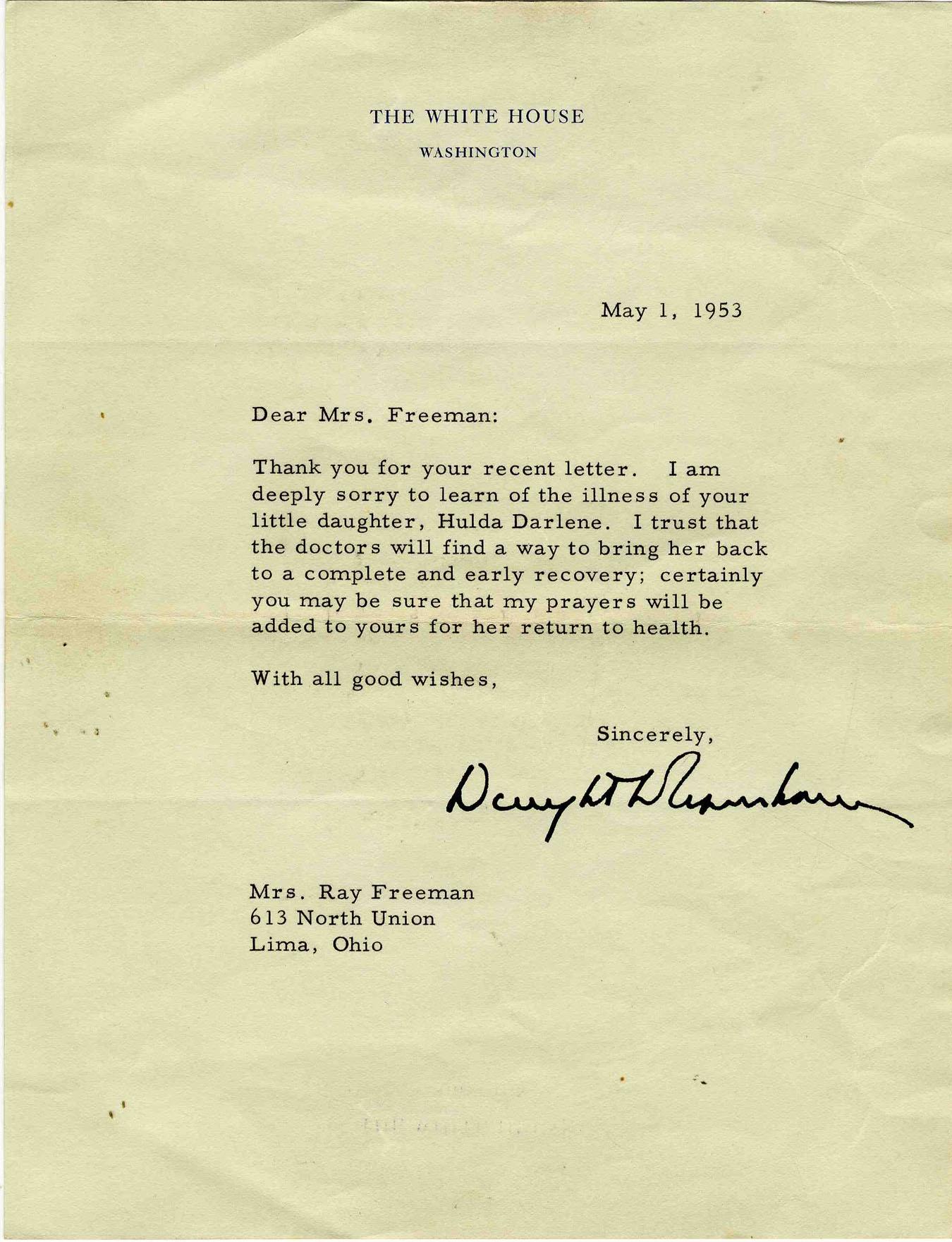 President Dwight D. Eisenhower typed letter signed. Composed on White House stationery and dated 1 May 1953, the President offers comfort to the father of a sick child: “...I am deeply sorry to learn of the illness of your little daughter...I trust...the doctors will find a way to bring her back to complete...recovery; certainly you may be sure that my prayers will be added to yours for her return to health. / With all good wishes...” Signed “Dwight D. Eisenhower” in bold black ink. Slight creasing else near fine condition.