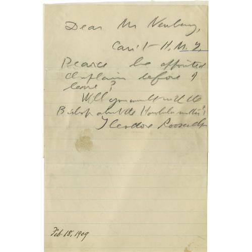 <B>President Theodore Roosevelt Autograph Memo Signed, Referencing Hawaii, 1/2 page, 8vo</B></I> On a simple sheet of lined paper, {Washington}, undated by Roosevelt but bearing an ink document date {in an unknown hand} of February 18, 1909. He had always taken a great interest in Hawaii, having been a strong advocate of its annexation in 1898. During the last days of his administration the president sends a private memo to his secretary of the Navy pressing for a decision in a matter he considers important. To "<I>Dear Mr. Newberry</B></I>" [Secretary of the Navy Truman Handy Newberry], requesting: "<I>Can't H.M.T. Pearce be appointed chaplain before I leave? Will you consult with the Bishop about the Honolulu matter?</B></I>" The president's term of office ended on March 3, 1909. Fine condition, partially mounted on verso.