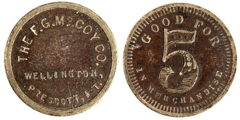 Obverse: The F.G. McCoy Co./ Wellington / Prescott A.T.; reverse: Good For / 5 / In Merchandise. Wm, 21mm, R8. Fine condition.