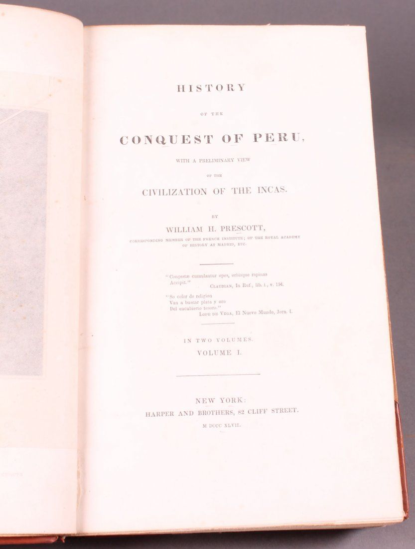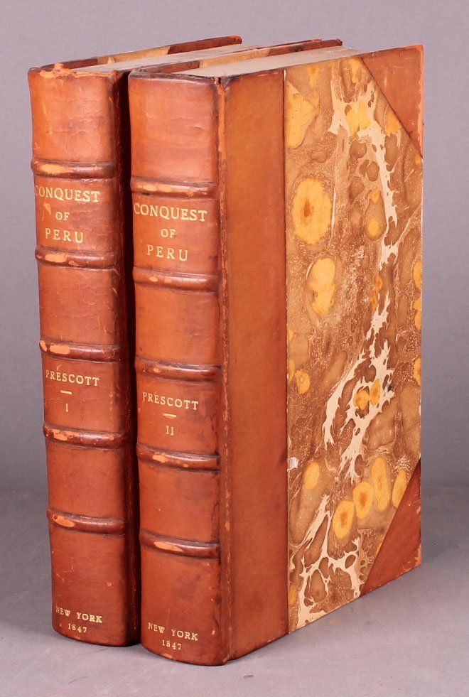 [Latin America/Conquistadors]. William H. Prescott. HISTORY OF THE CONQUEST OF PERU, With a Preliminary View of the Civilization of the Incas. 2 Vols. NY: Harper & Brothers, 1847. 8vo. xl, 527; xix, [i], [1]-547pp. Later (but not modern) half leather and marbled board, marbled eps. 1st edition. Sabin 65272.