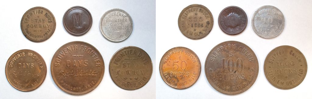 (6) SOUVENIR FRONTIER DAYS // 10 BUCKS Aluminum, 50 BUCKS & 100 BUCKS & 500 BUCKS & 1000 BUCKS Brass, SLIPPERY GULCH // 5¢ Brass Tokens used during Slippery Gulch Rodeo Days.