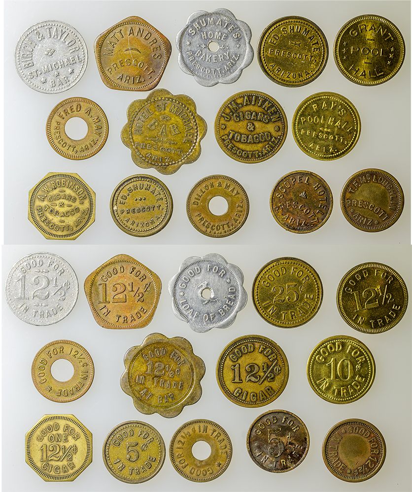 c1891 Lot of 14. From the town of Prescott, theses classic tokens are from the various saloons, hotels and pool halls around the town over the course of time. Most are round, with 1 octagon and 2 scallops. 2 have cutouts, and metals range from brass to alum. Rated R3 to R8. The names of the establishments include Grant Pool Hall, J.M. Aitken Cigars & Tobacco, Hotel St. Michael Bar, The Scopel Hotel, Ray`s Pool Hall, A.W. Robinson Cigars & Tobacco, 3 from Ed Shumate, and many more. Prescott was founded on early mining claims. It was incorporated in 1883, and served as the Territorial capitol in 1867 and again in 1877. Prescott was named to honor William H. Prescott, whose writings were popular during the Civil War. Bud Bassett Collection - HKA#65329