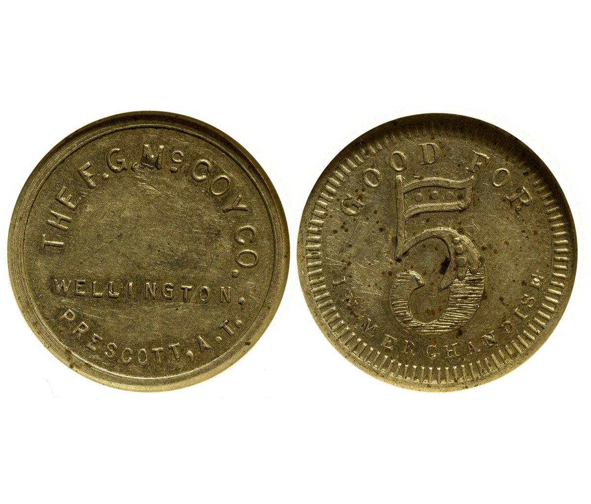 An excellent and rare 5 cent merchandise credit at The F.G. McCoy Company. This token is in very nice to excellent condition. -29102