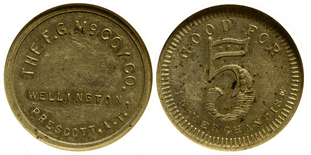 An excellent and rare 5 cent merchandise credit at The F.G. McCoy Company. This token is in very nice to excellent condition.