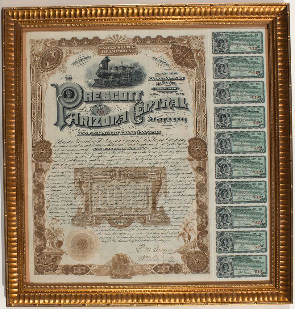 c1888 This bond is a first mortgage six per cent sinking fund. The bond measures 16" x 15" and the frame measures 18.55" x 18." The bond has very little wear. The plans for the Prescott and Arizona Central Railway Co. was formed in 1884 but the company was plauged with problems and only lasted a few years. Bud Bassett Collection - HKA#65588