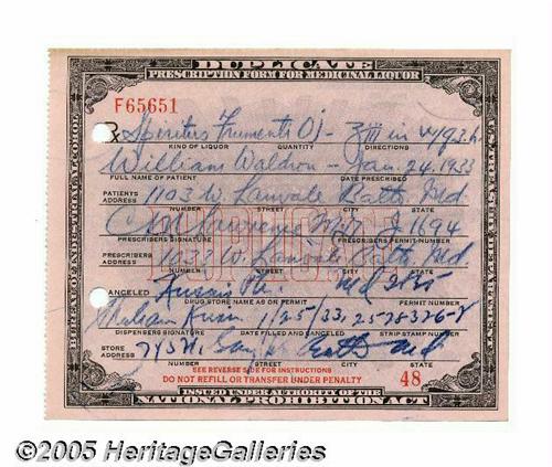 <B>"Prescription Form for Medicinal Liquor Issued Under Authority Of The National Prohibition Act"</B></I> Prohibition Act of 1920. "Prescription Form for Medicinal Liquor Issued Under Authority Of The National Prohibition Act," 4.5" x 5.5". Extremely fine. This is a duplicate version. (The originals were in white and are extremely rare.) Partially printed, completed by hand in a carbon copy impression. Two holes at left for filing and storage. These forms were used to prescribe liquor at a time when alcohol was considered to be as dangerous as opium or any other "hard" drug. Many "prescriptions" were just a way of skirting the law. The 18th Amendment to the U.S. Constitution, which prohibited "the manufacture, sale or transportation of intoxicating liquors," became law in 1920. It was repealed thirteen years later in 1933 by the 21st Amendment. A great item from one of the more curious periods in our country's history. Lot:252