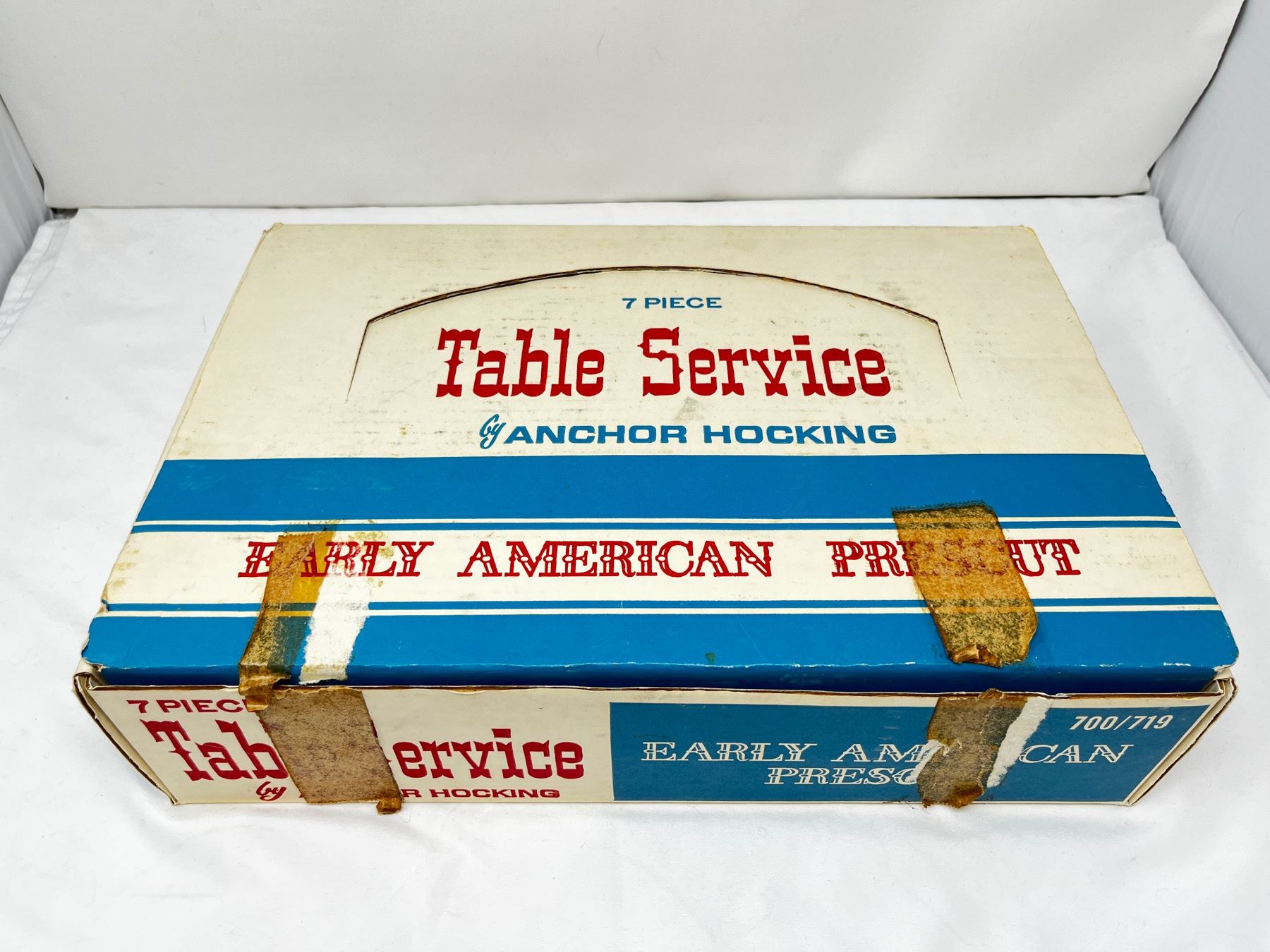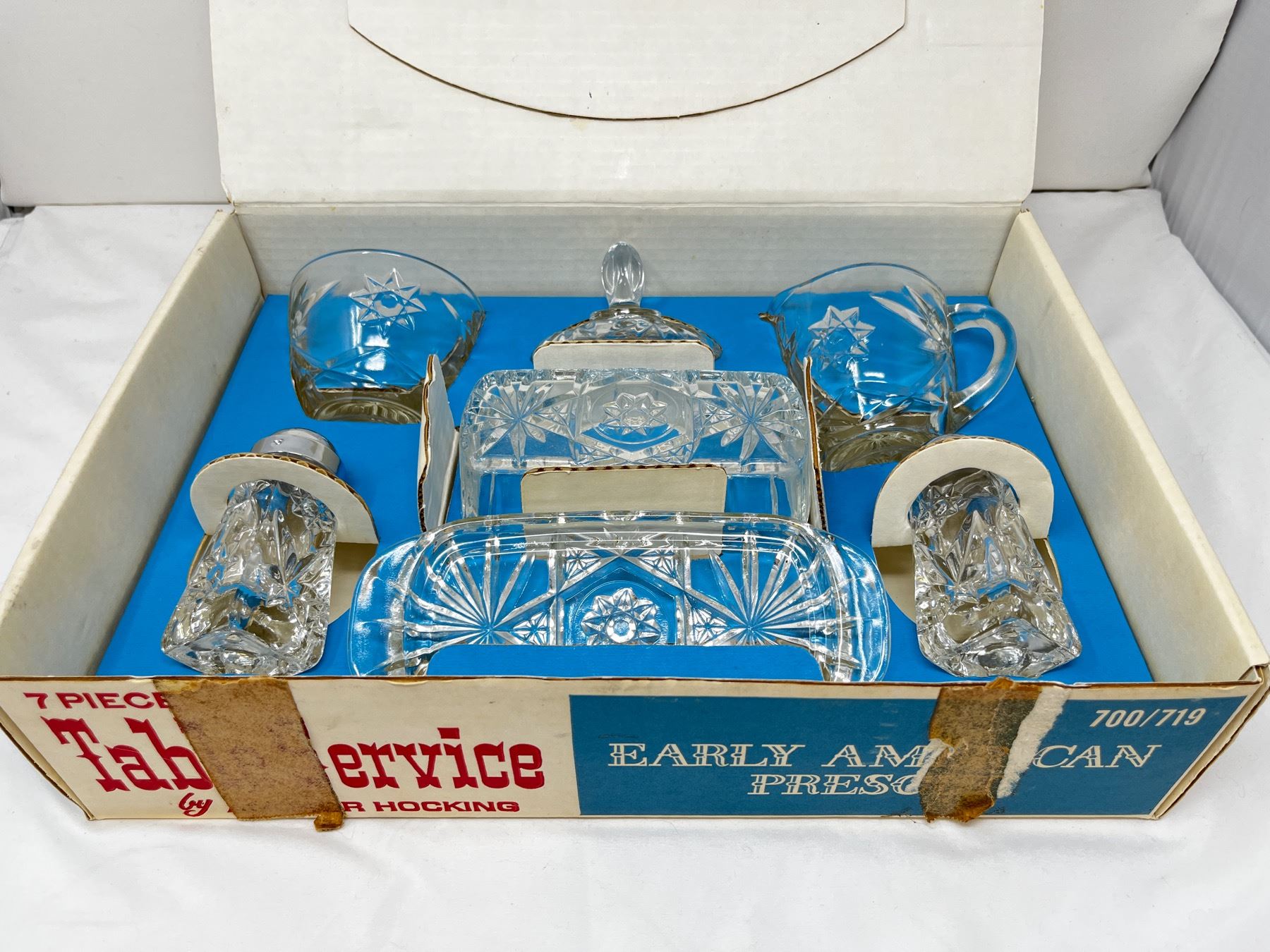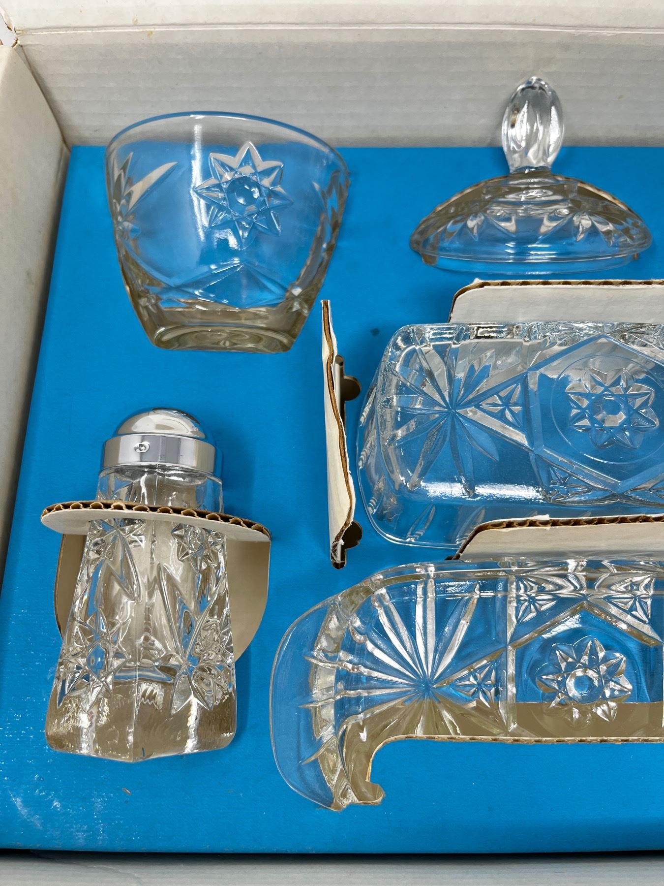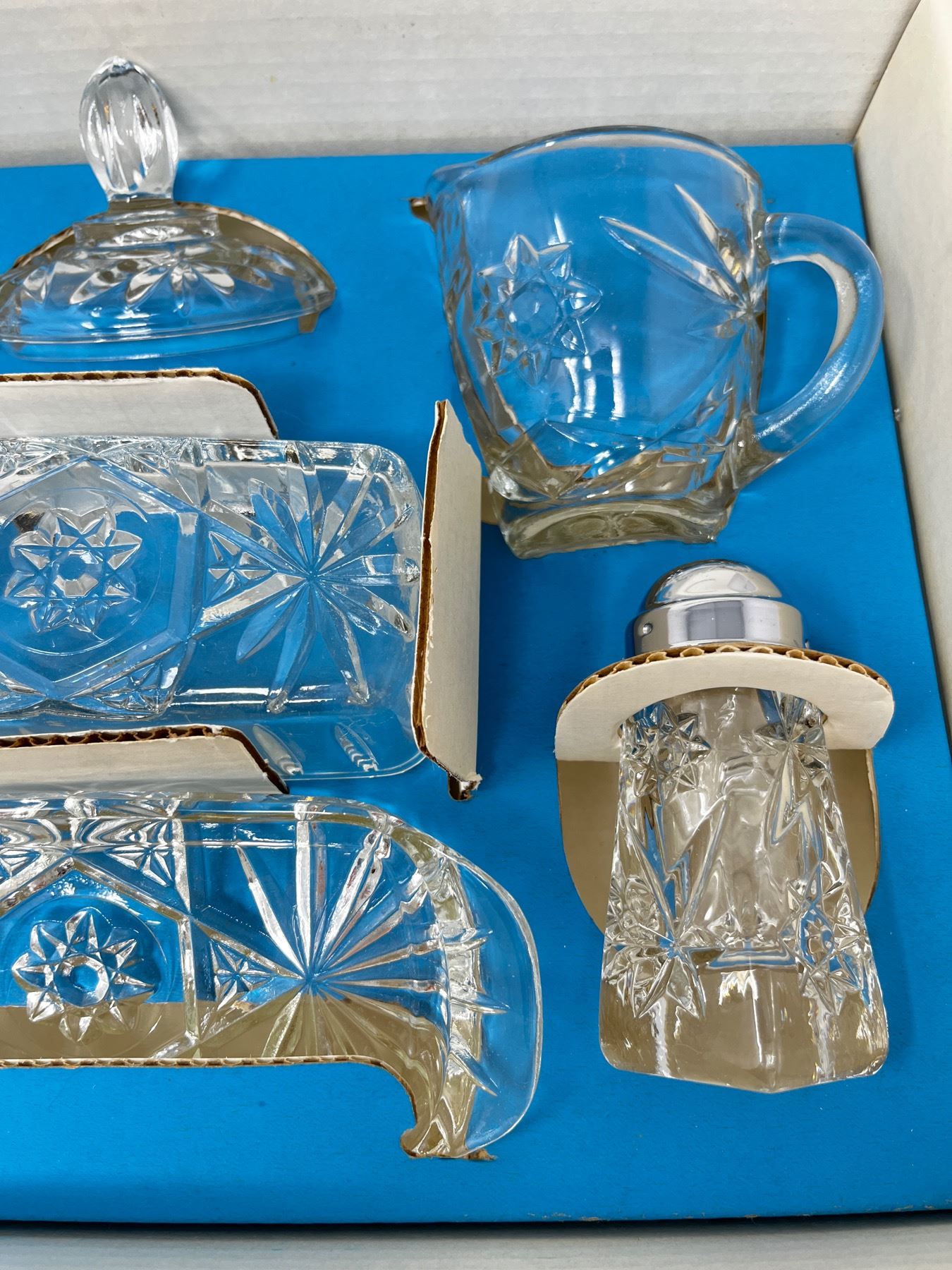 Includes butter dish with lid, salt and peppers and cream and sugar bowl with lit. New old stock in box.