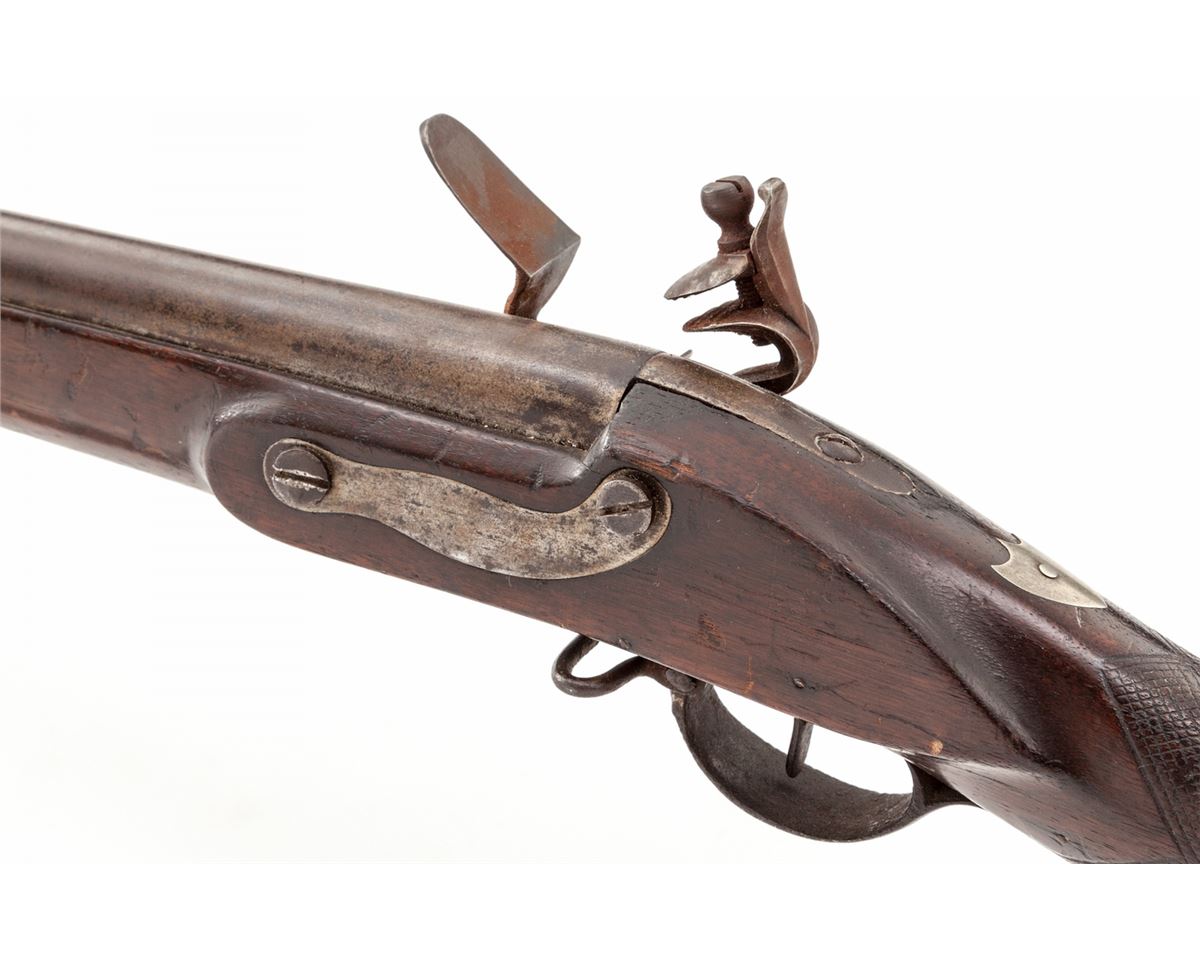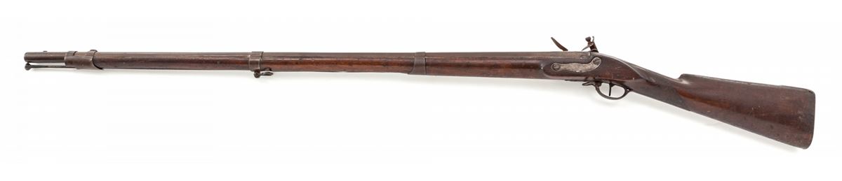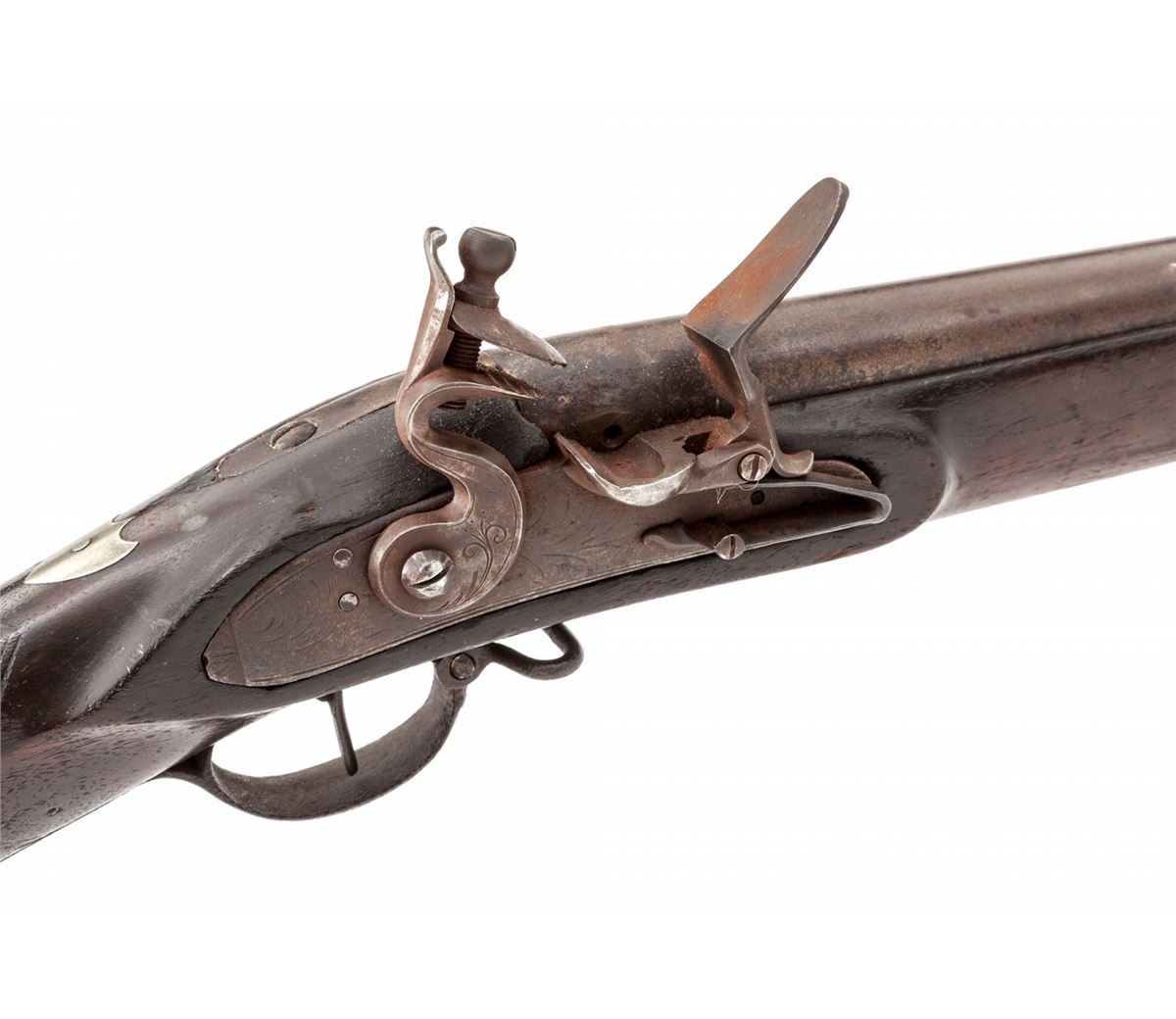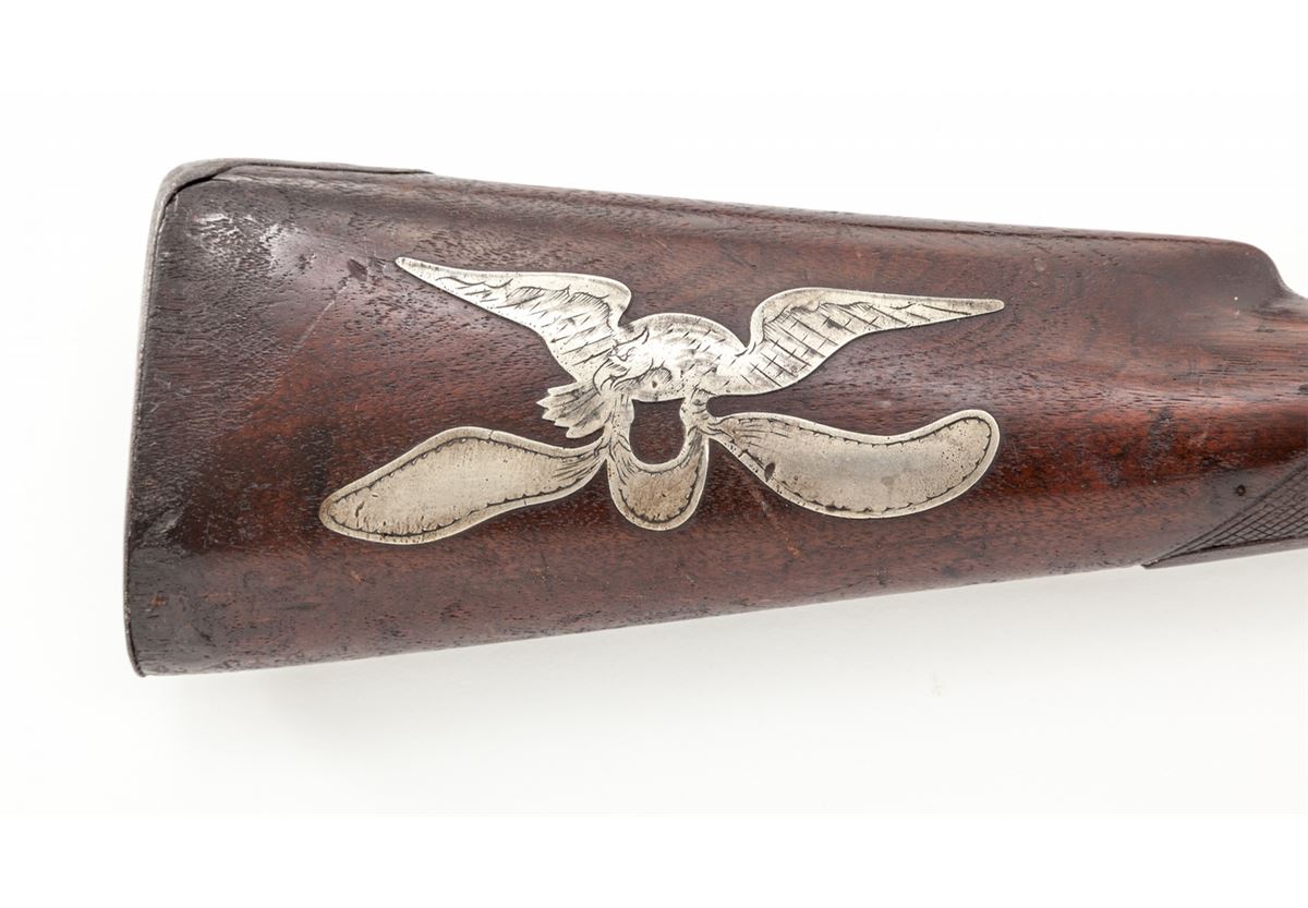 Presentation American Flintlock Musket, .69 cal. smoothbore, 41-1/2'' round barrel, 55'' overall, walnut stock with checkered wrist and 3''x5'' silver inlay of the American eagle nicely engraved on right side butt area; silver shield escutcheon in wrist area; three (3) spring-retained barrel bands secure the barrel to the stock. Ca. 1820 period. Muskets of this type were custom period built to be presented to recognize individuals at shooting matches for special services of valor. Condition is very good, as properly reconverted back to its original flintlock configuration. Walnut stock shows a nice dark aged patina with moderate handling dings and wear. Est.: $1,800-$2,500. (Antique)