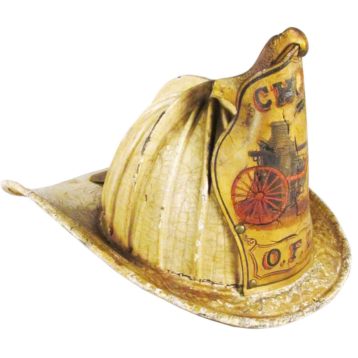Presentation "Chiefs" High Eagle Fire Helmet. Ca. 1890's by Wilson. Hand painted leather front shield with Chief "O.F.D." and Steam Fire Engine. Presentation plaque on rear brim, "Presented to R.G. Blackburn Chief, Oswego Fire Dept. by the Life Saving Corps N.Y.F.D. 1894. Comes with picture of Fire Chief wearing his helmet. Very good condition with minor age staining and wear.