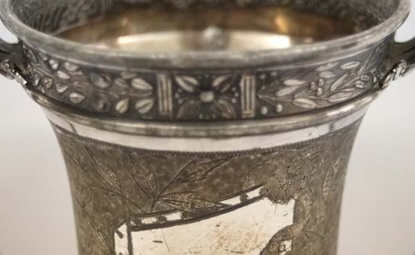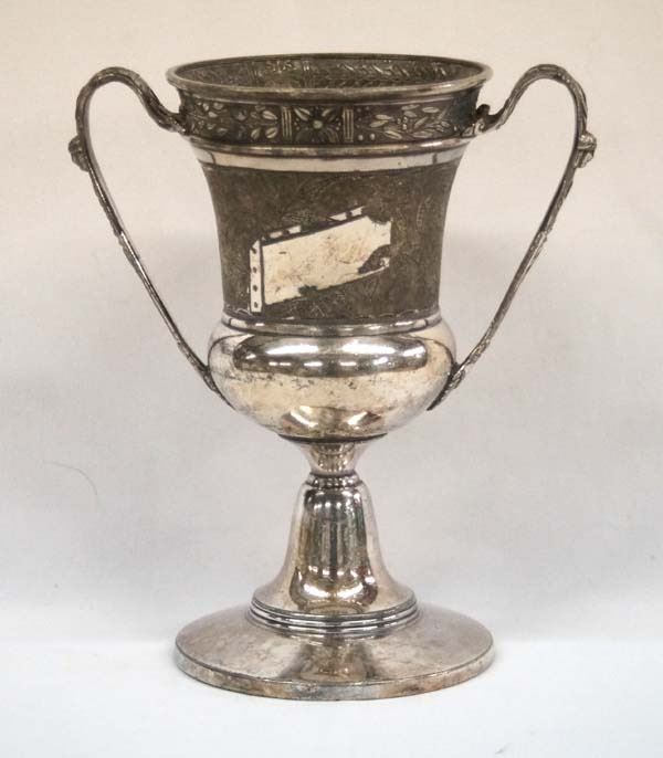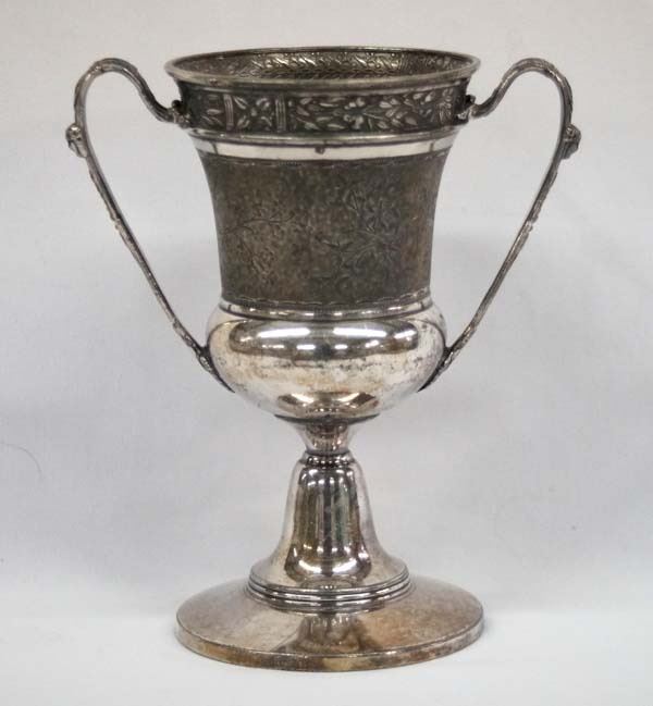 Presentation Cup/Urn. Marked ''MFD & Plated By Reed & Barton Pat. Feb 4 1880'' and numbered 423. This item measures 7''H x 6.25''W
