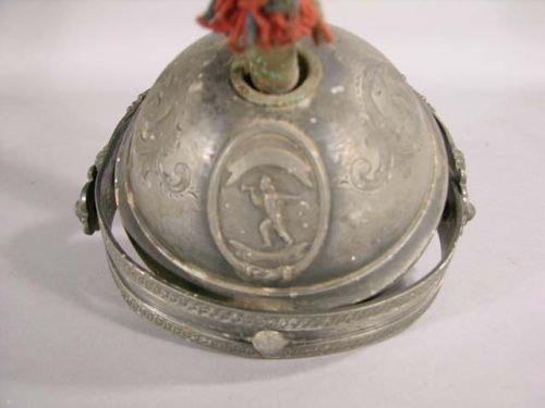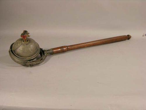 Presentation fire torch brass with wood handle engraved bowl - presented by the Home Ins. Co. of NY. to Rescue Steam Fire Co #4, York, PA. The bowl has broken loose from the bracket on the side. Very rare.